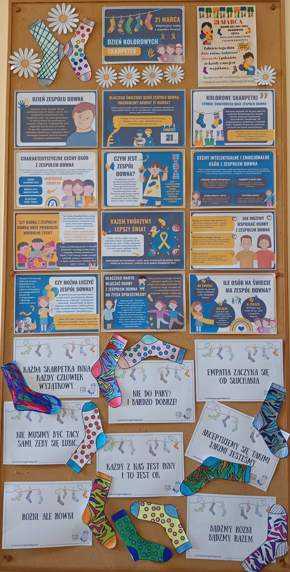 Społeczność naszej szkoły aktywnie włączyła się w obchody tego ważnego dnia, okazując pamięć i wsparcie osobom z zespołem Downa. Symbolem solidarności było założenie kolorowych, niepasujących skarpetek. W inicjatywie uczestniczyli zarówno uczniowie, jak i nauczyciele oraz pracownicy szkoły, wyrażając w ten sposób szacunek, tolerancję i zrozumienie.Gazetka poświęcona tematyce zespołu Downa została umieszczona obok gabinetu pedagogów.