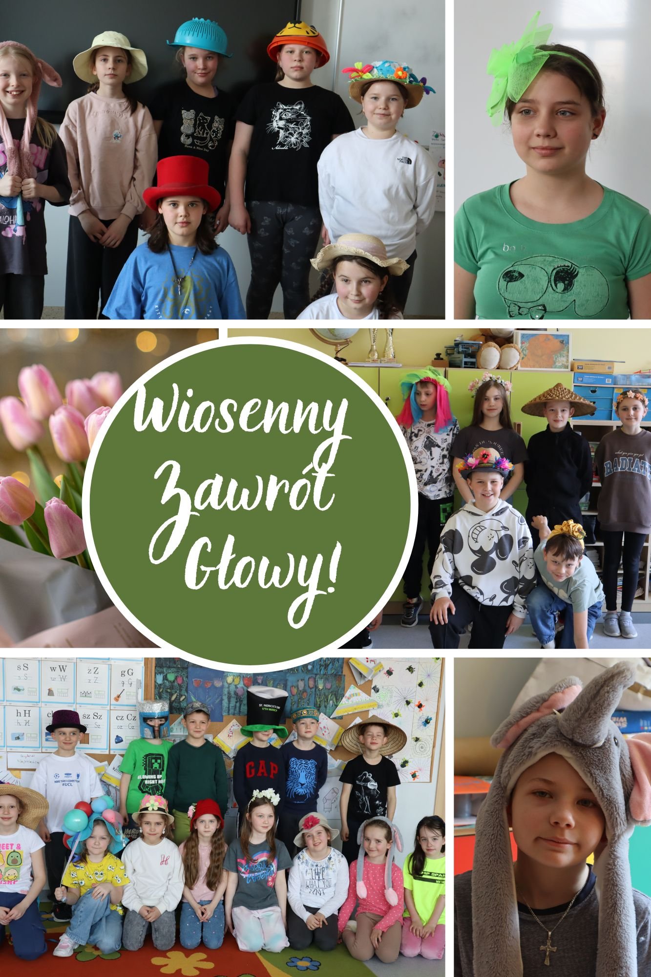 W ramach akcji „Wiosenny zawrót głowy” zorganizowanej z okazji pierwszego dnia kalendarzowej wiosny, uczniowie przyszli do szkoły w niezwykłych, kolorowych i pomysłowych nakryciach głowy. Kapelusze pełne kwiatów, opaski z motylami czy zabawne czapki sprawiły, że wiosna naprawdę zagościła w naszej szkole!