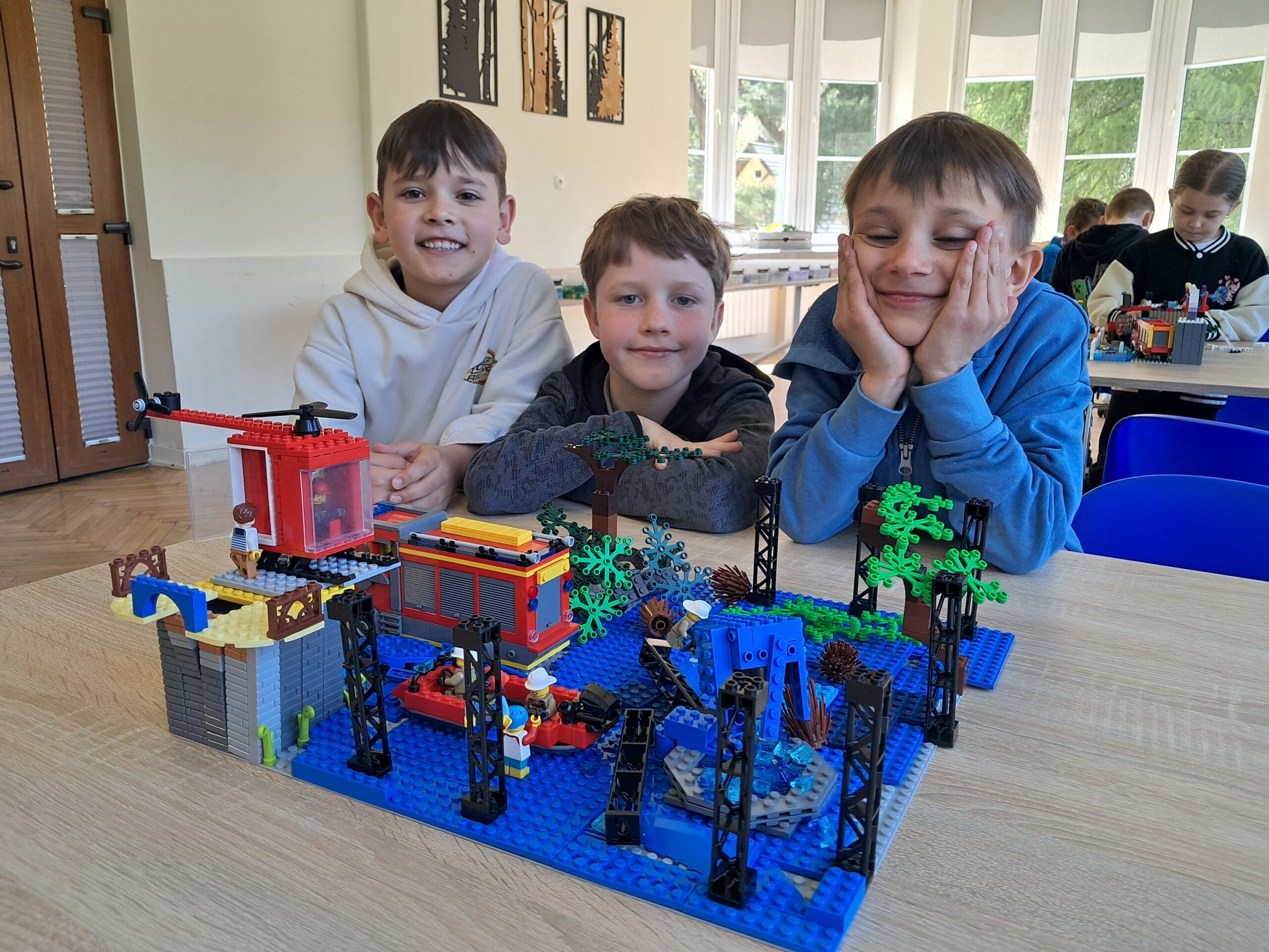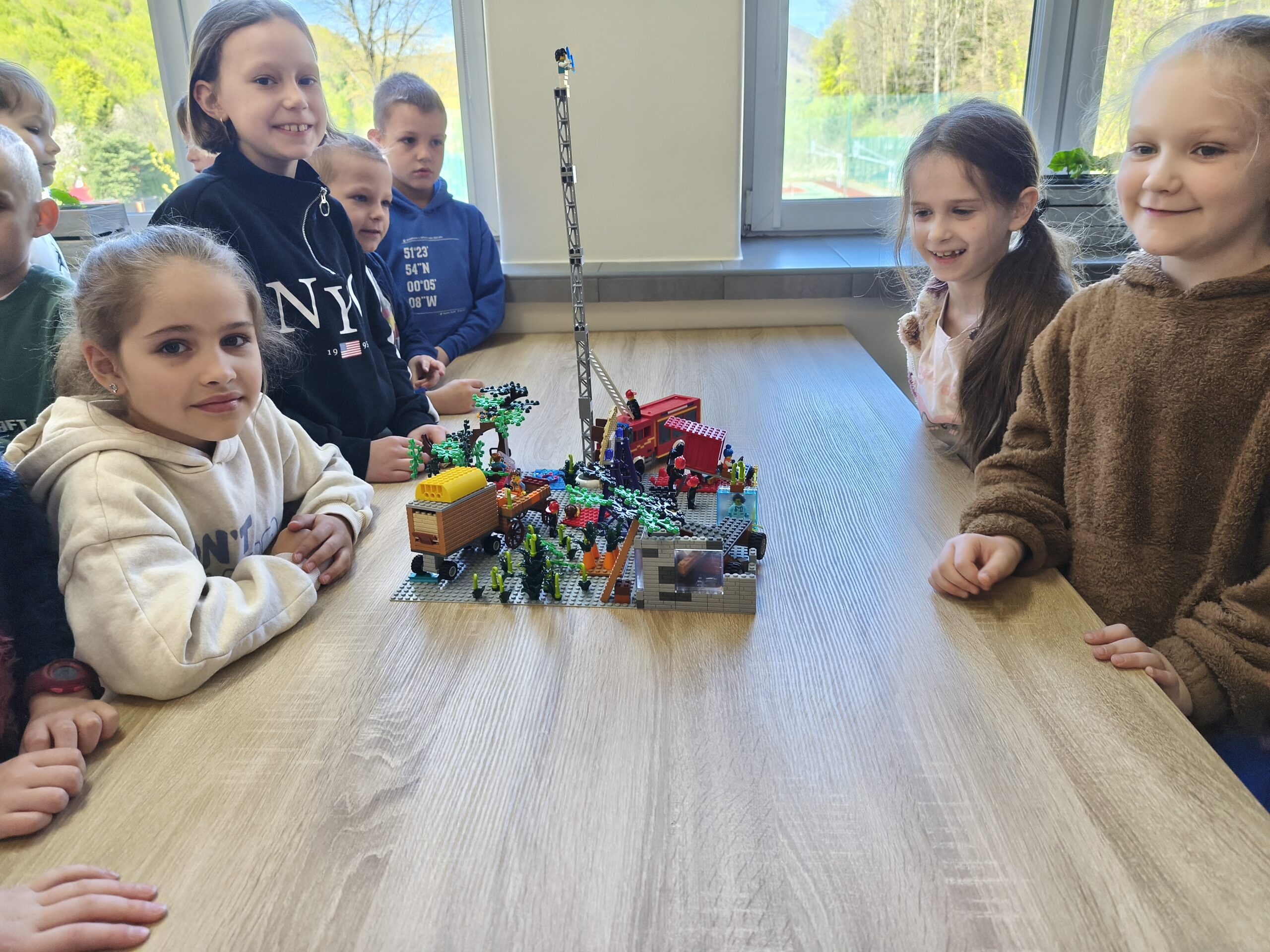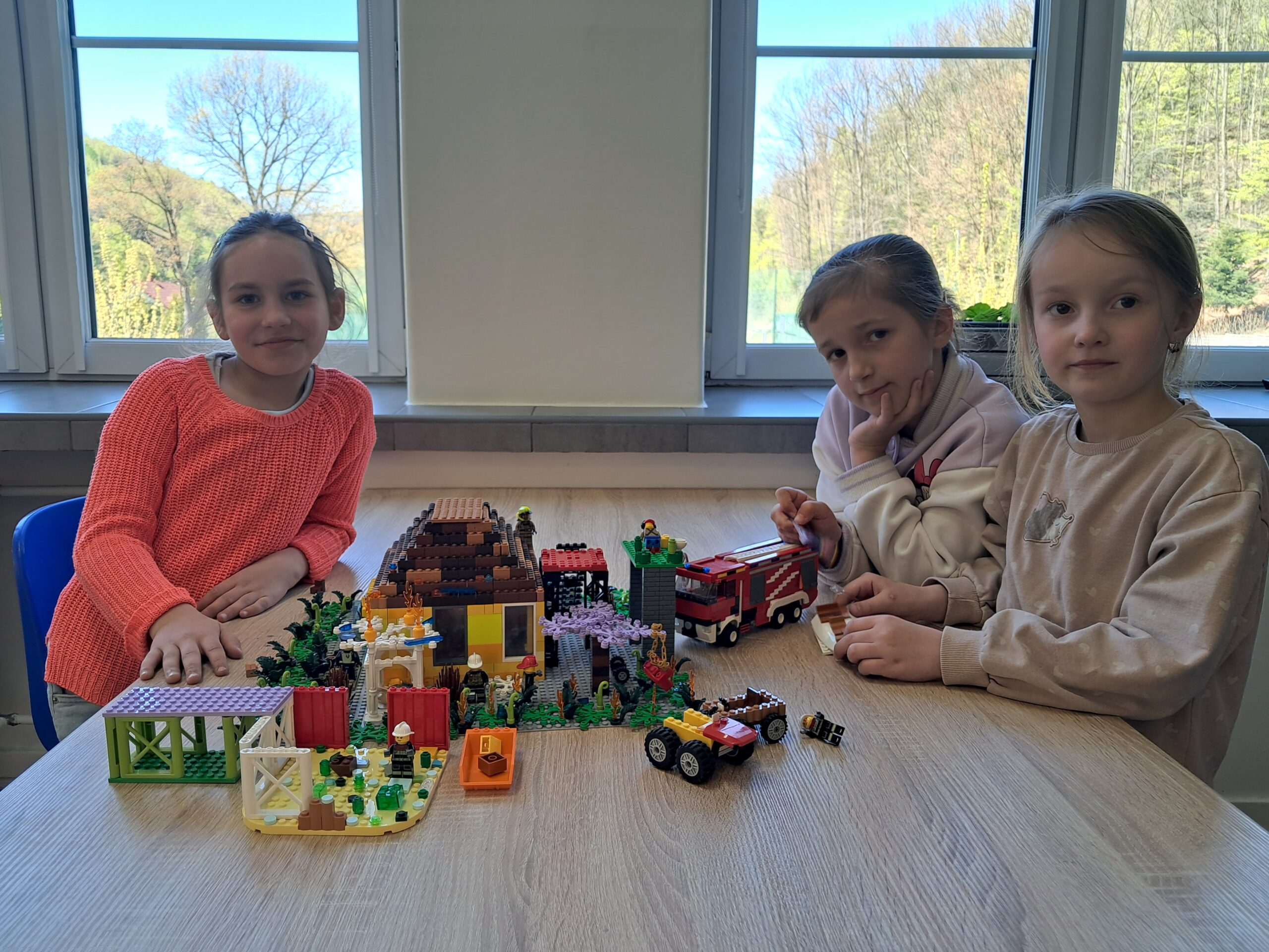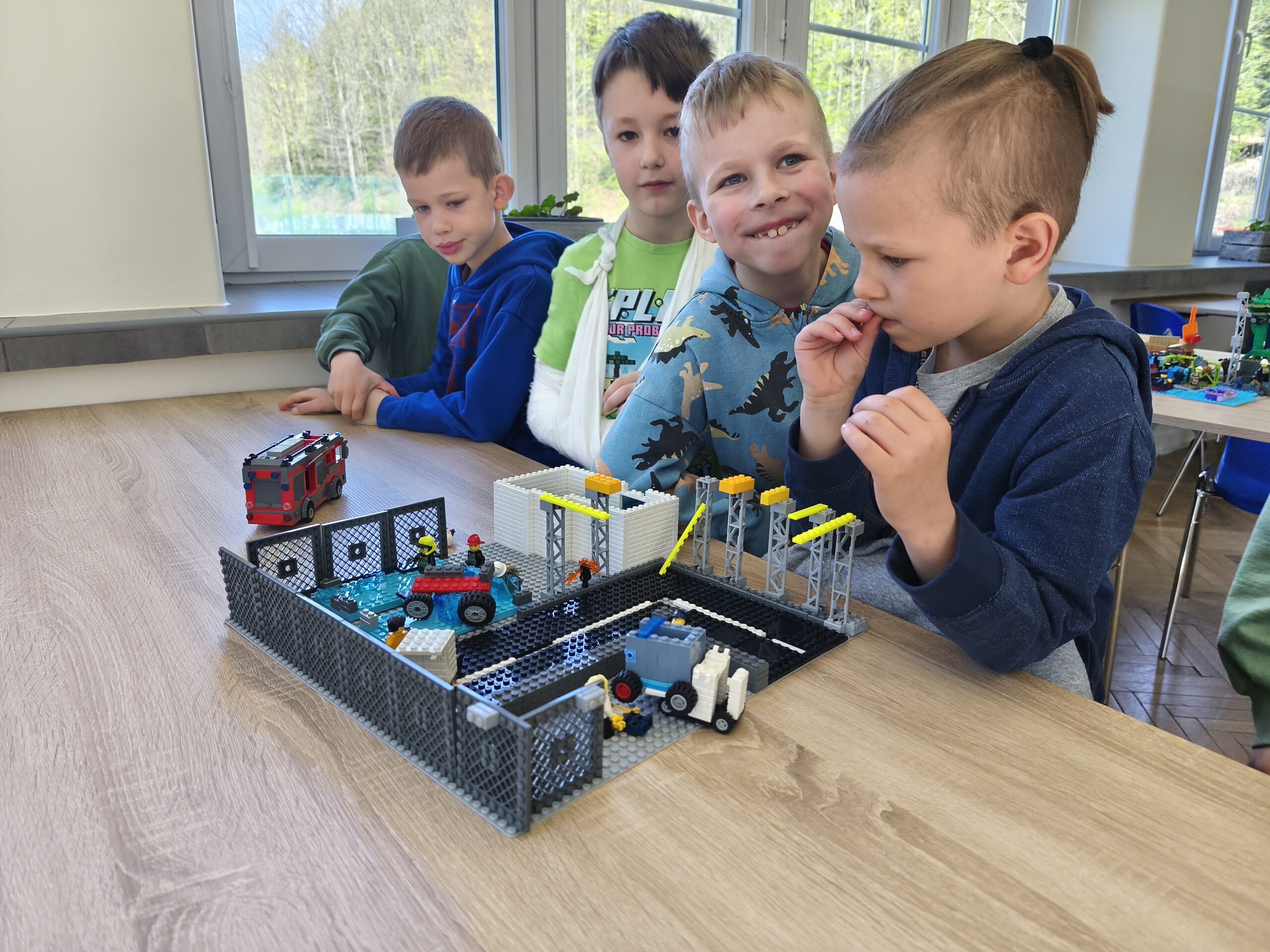 Na początek uczniowie poznawali zagrożenia ekologiczne związane z akcjami ratowniczo-gaśniczymi. Brzmi poważnie? Może trochę, ale w praktyce było też mnóstwo radości! Dzieci budowały makiety z klocków LEGO, a następnie prezentowały swoje projekty, snując przy tym barwne historie. Nie zabrakło pomysłowości, a wyobraźnia pracowała na najwyższych obrotach. Przy okazji uczniowie rozwijali zdolności konstrukcyjne, ćwiczyli koncentrację i doskonalili sprawność manualną.