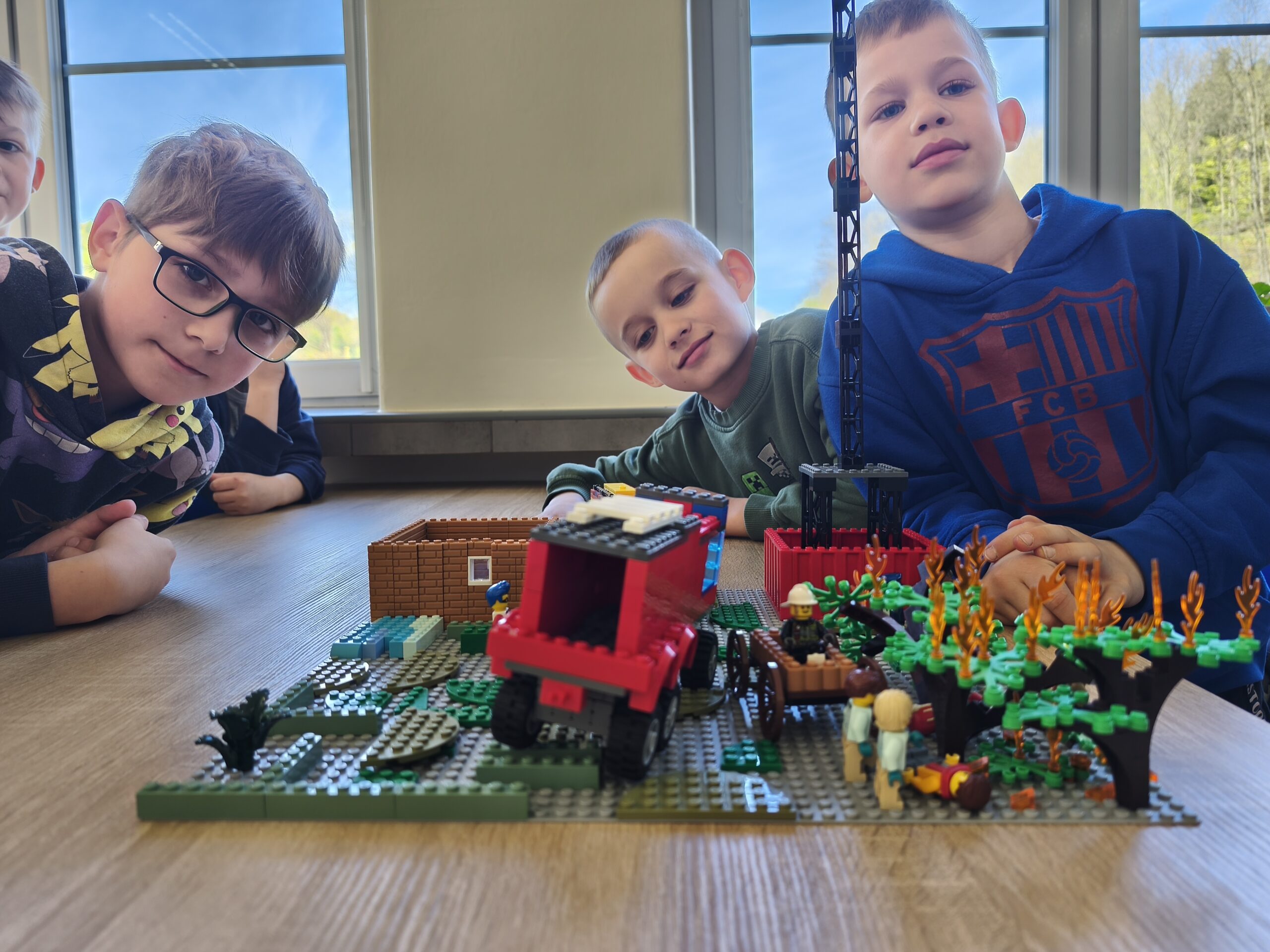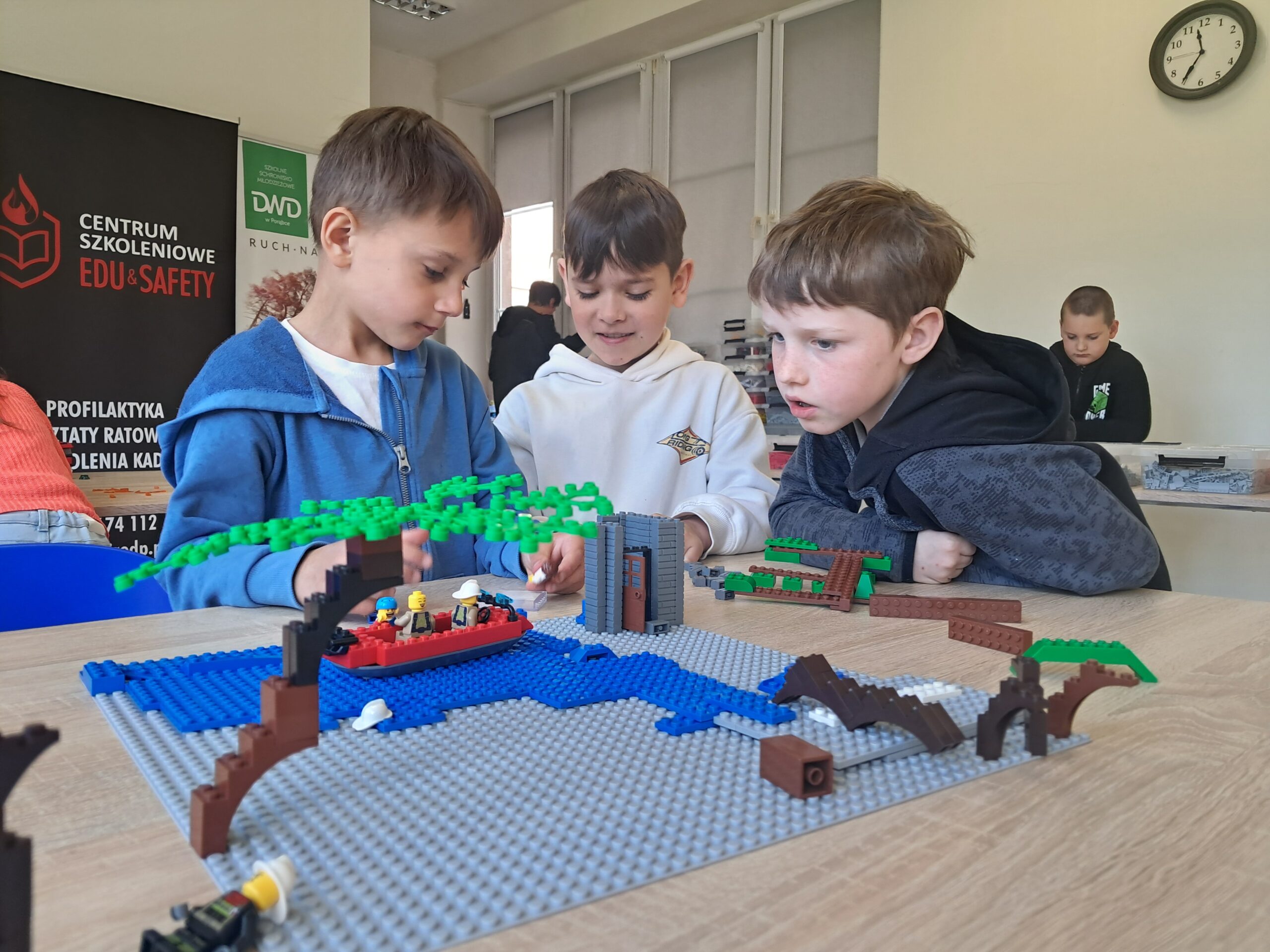 Dzień rozpoczęliśmy od wyzwań inżynieryjnych. Z klocków LEGO dzieci budowały scenariusze, w których głównymi bohaterami byli strażacy. Powstały szczegółowe makiety przedstawiające akcje ratunkowe podczas: