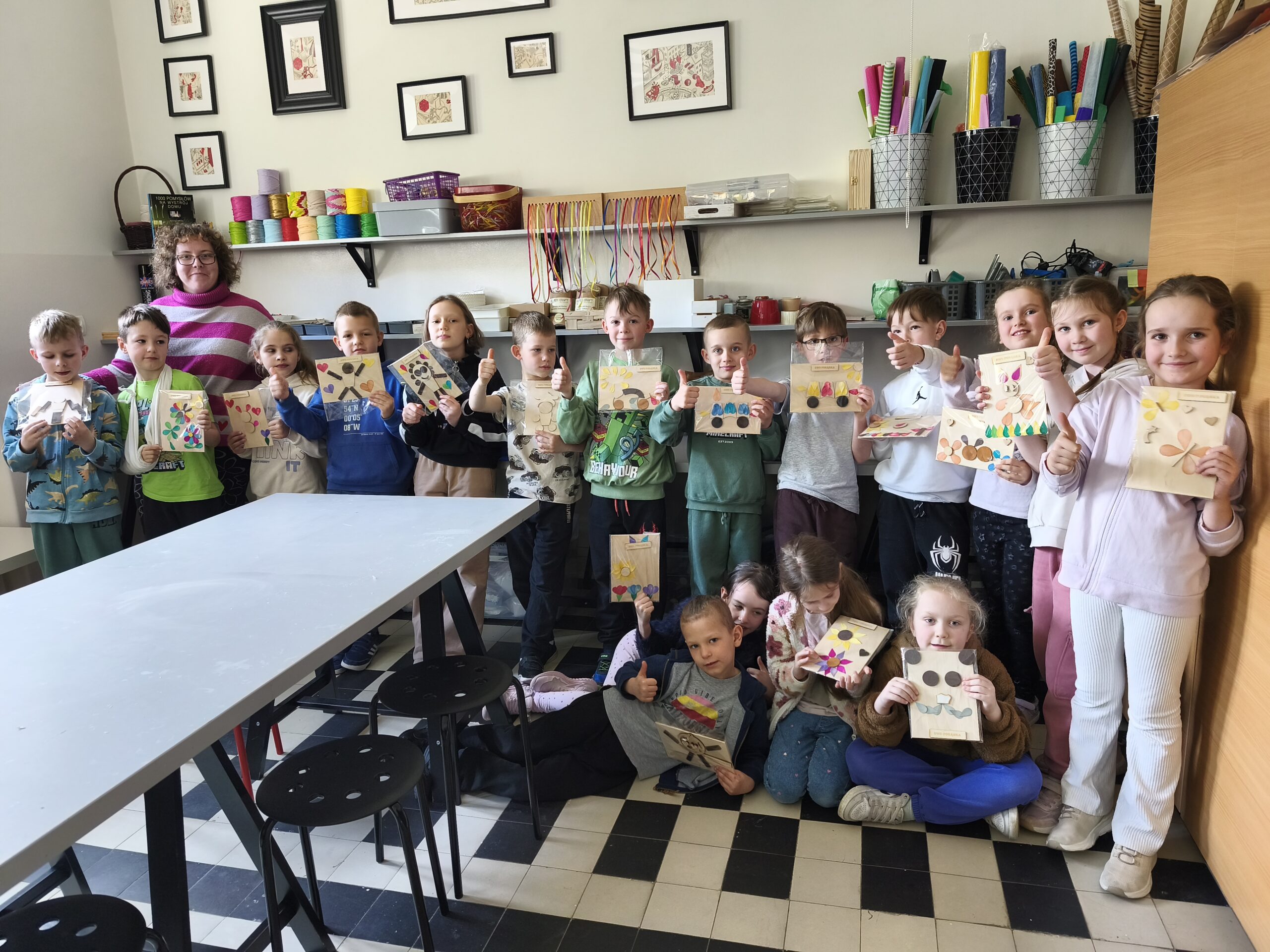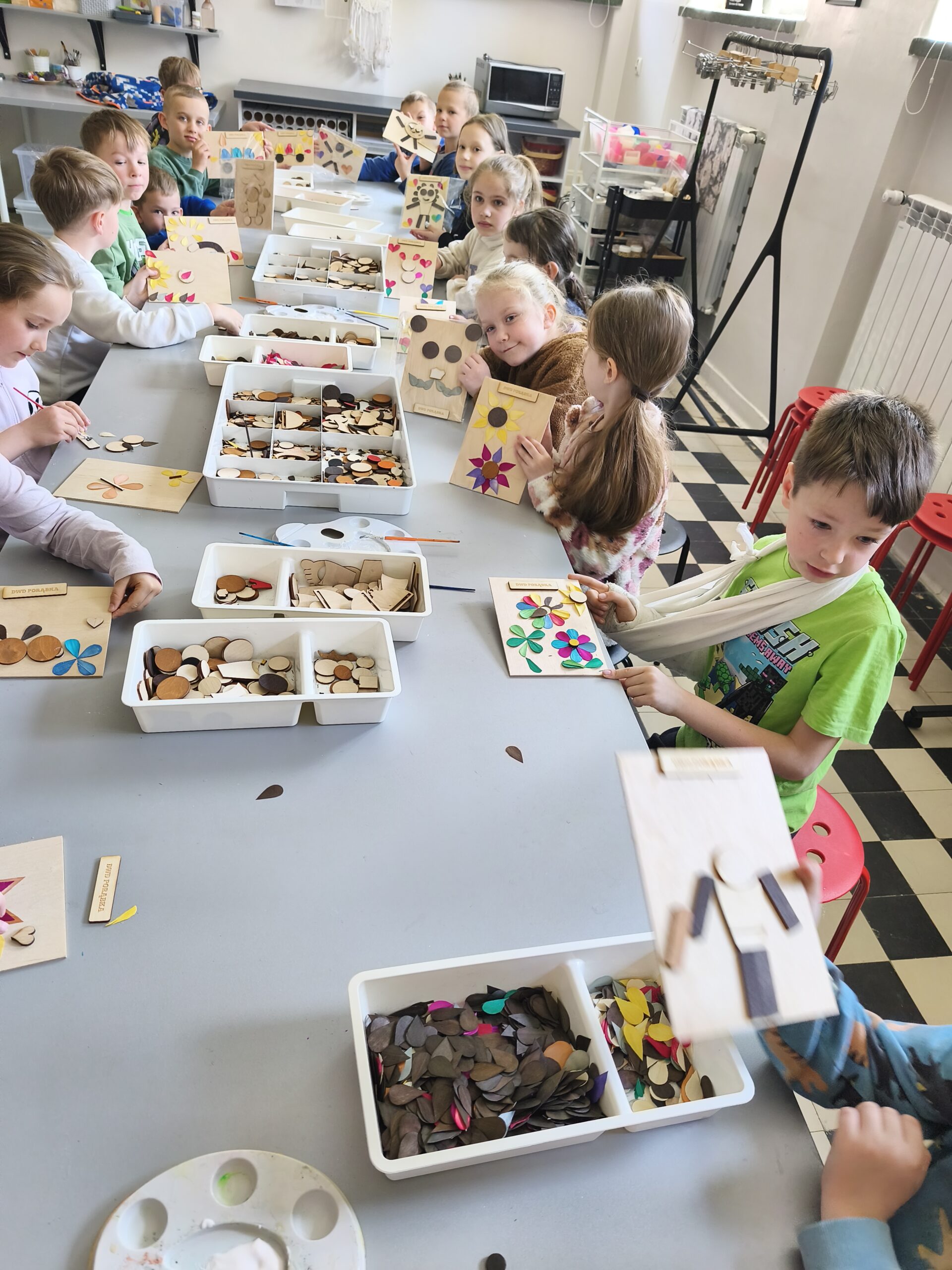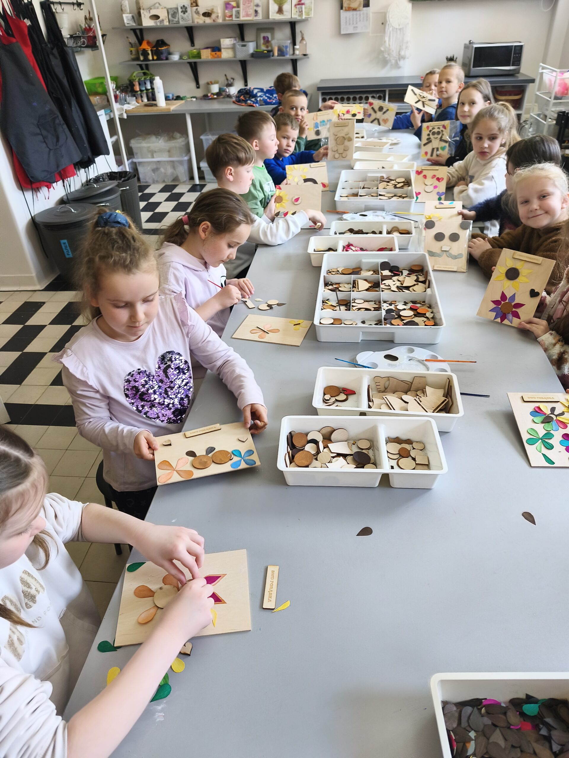 Kolejnym etapem było tworzenie eko-obrazów z drewna, czyli prawdziwe spotkanie sztuki z naturą. Powstały wyjątkowe prace z naturalnych materiałów i „drugiego obiegu”, które udowodniły, że nawet to, co wydaje się niepotrzebne, może zyskać drugie życie. Kreatywność dzieci nie znała tu granic. Niektóre pomysły mogłyby zawstydzić niejednego artystę!