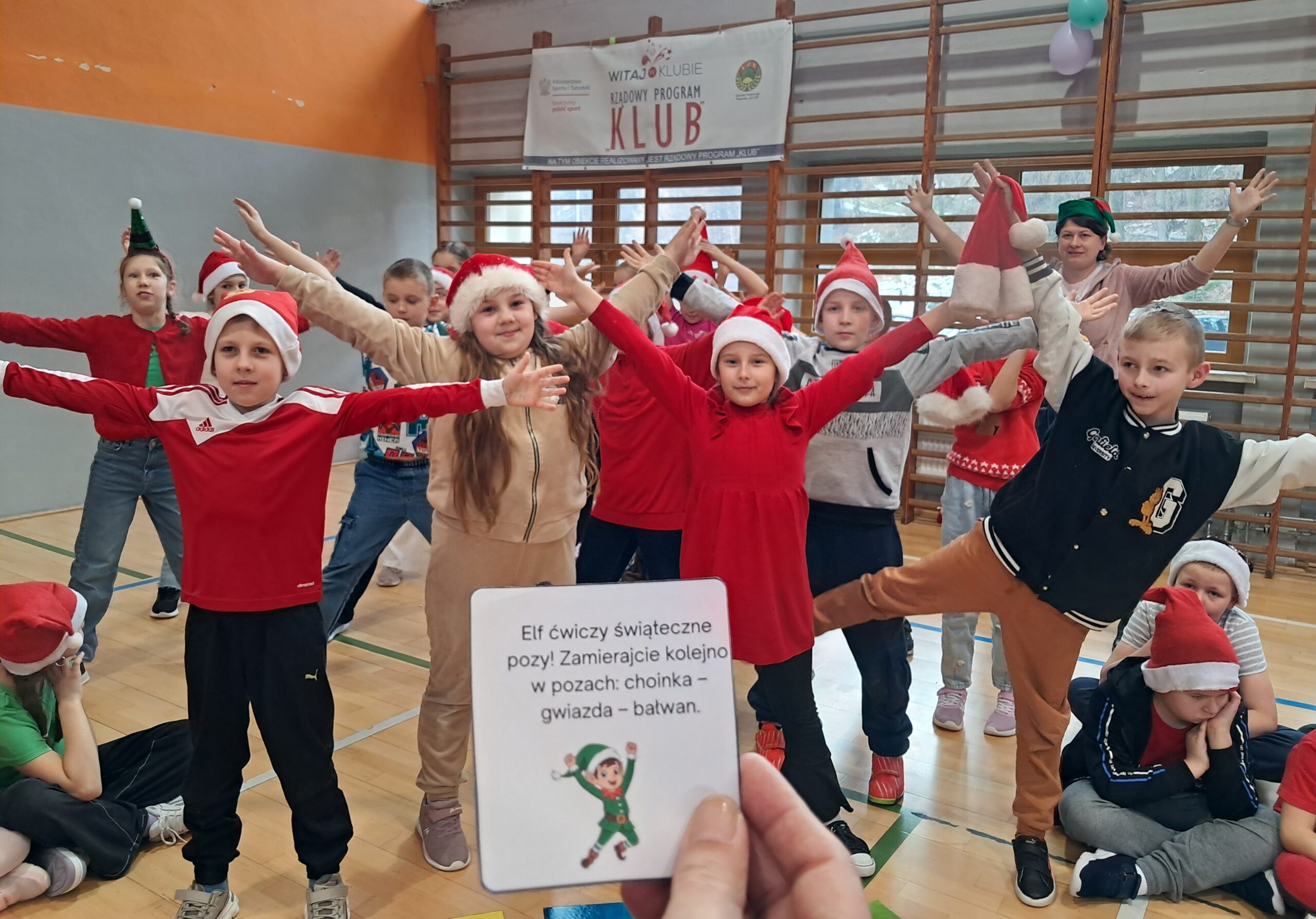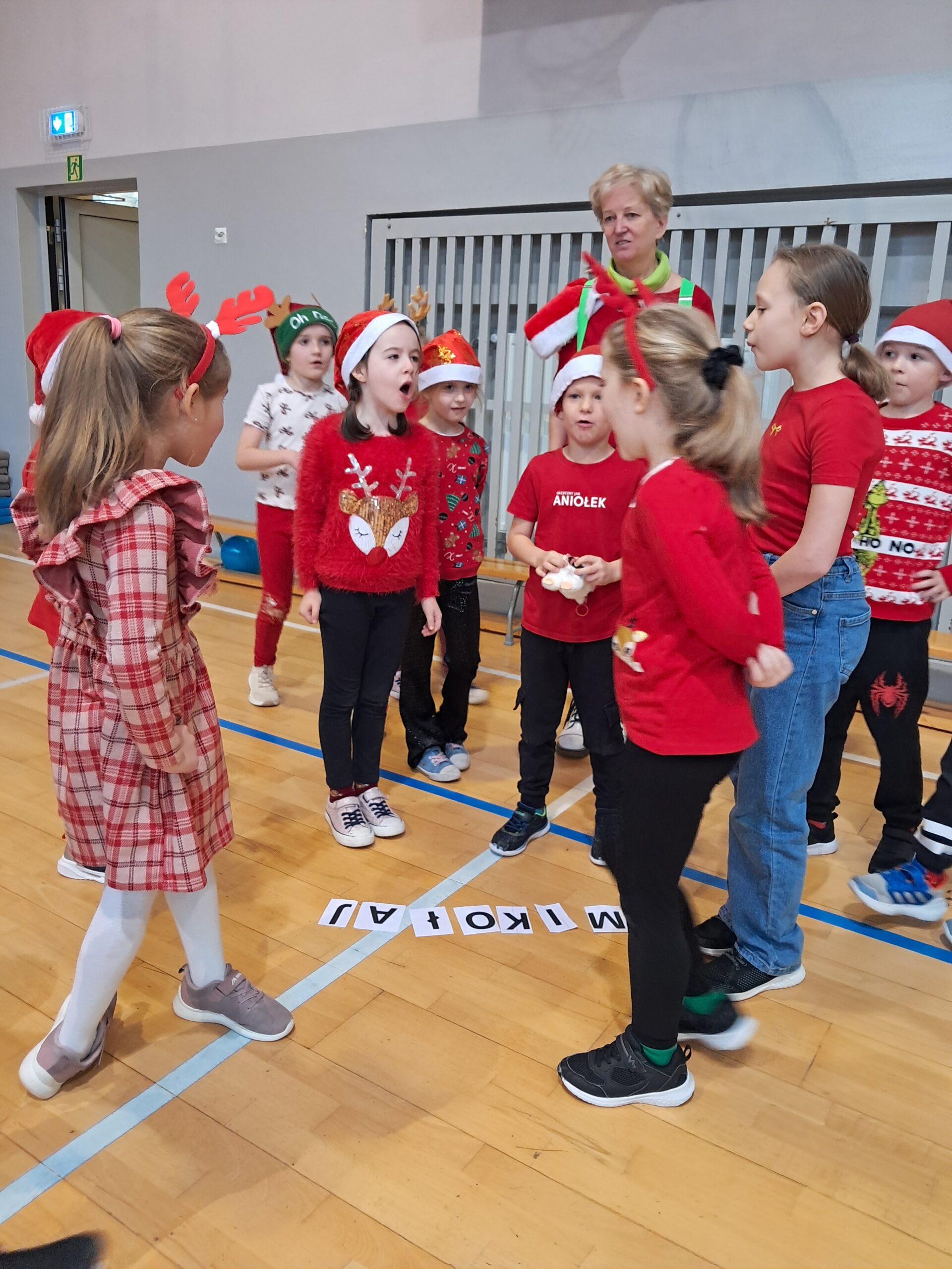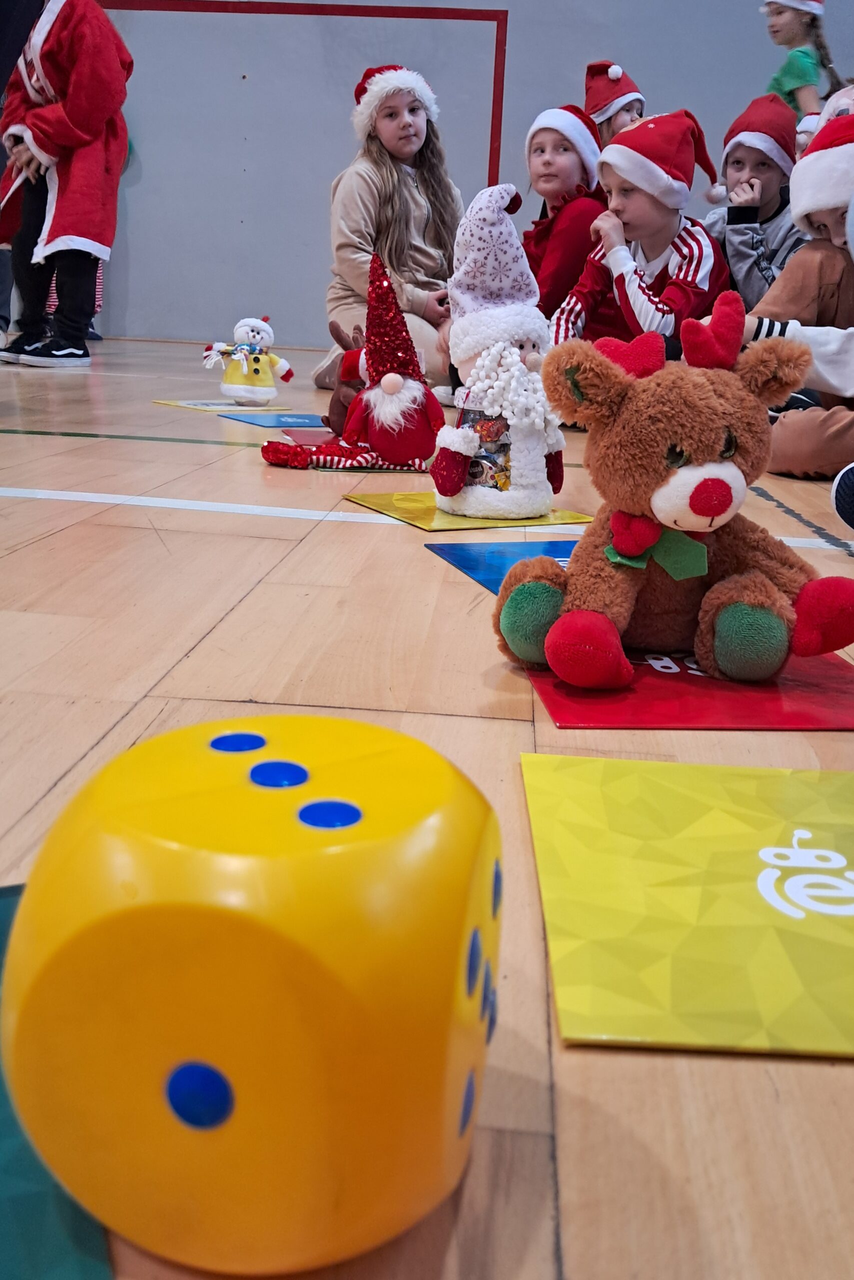 Na szczęście dzieci ruszyły do akcji! W ogromnej planszówce „Uratuj Mikołaja” rzucały kostkami, przesuwały świąteczną maskotkę-pionek i wykonywały brawurowe zadania: od szukania ukrytych obrazków, przez ćwiczenia i tańce, aż po zagadki przygotowane przez elfy. Atmosfera była pełna śmiechu i emocji – każdy krok przybliżał drużynę do mety i… do odnalezienia zaginionych pomocników.