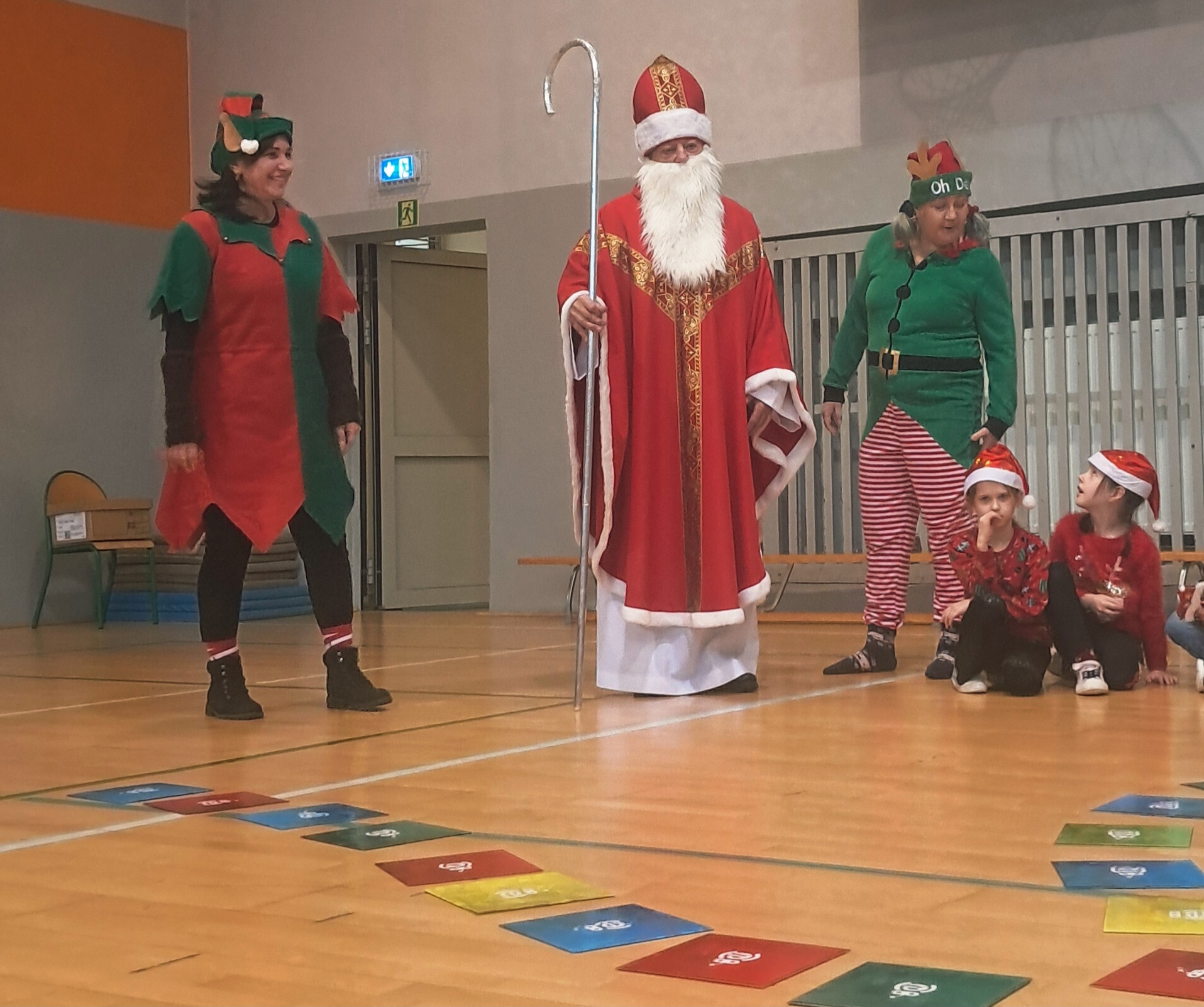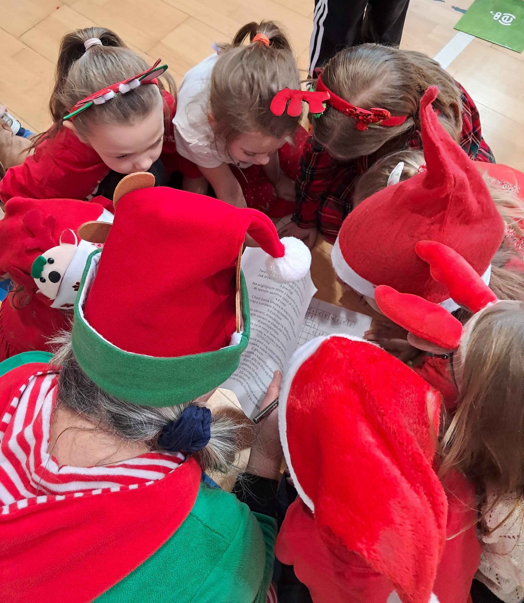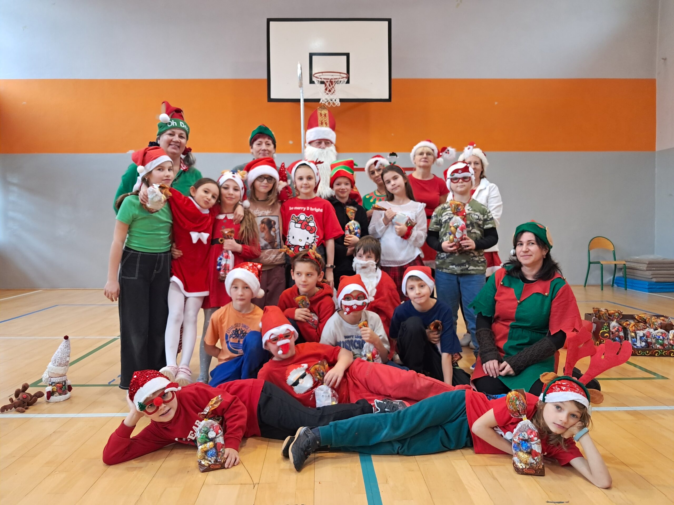 Na szczęście dzieci ruszyły do akcji! W ogromnej planszówce „Uratuj Mikołaja” rzucały kostkami, przesuwały świąteczną maskotkę-pionek i wykonywały brawurowe zadania: od szukania ukrytych obrazków, przez ćwiczenia i tańce, aż po zagadki przygotowane przez elfy. Atmosfera była pełna śmiechu i emocji – każdy krok przybliżał drużynę do mety i… do odnalezienia zaginionych pomocników.