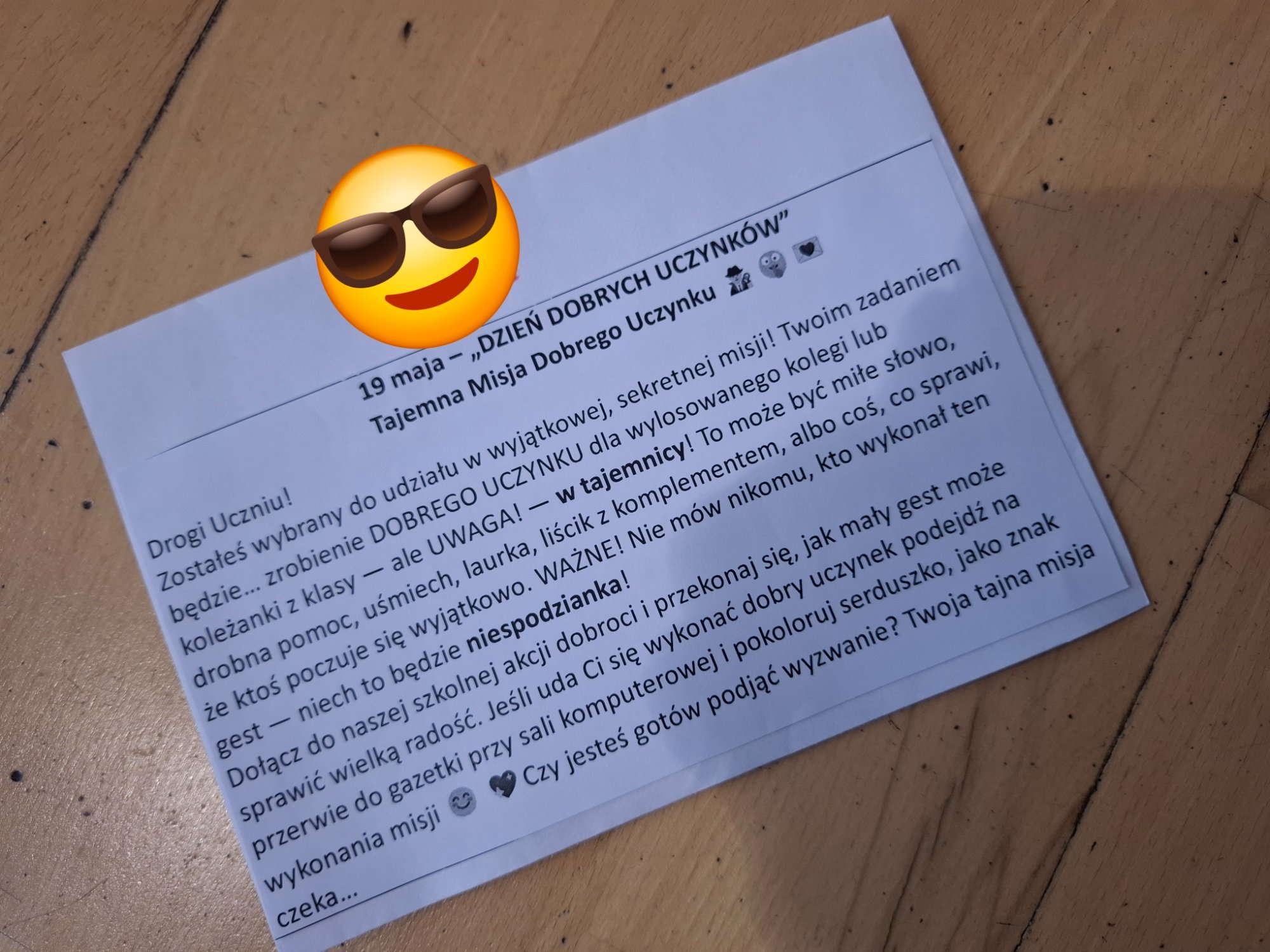 W naszej szkole w ostatnich dniach wydarzyło się coś wyjątkowego. Z okazji „Dnia Dobrych Uczynków” uczniowie wybrali się na nietypową misję — „Tajemną Misję Dobrego Uczynku!”🎯💌 Akcja miała jeden, prosty cel: sprawić komuś radość – w tajemnicy. Każdy z uczestników wylosował kolegę lub koleżankę z klasy, dla którego miał wykonać miły gest. Mogło to być coś drobnego – uśmiech, pomoc przy zadaniu, liścik z komplementem, własnoręcznie wykonana laurka, a nawet uporządkowana półka z książkami. Warunek był jeden: wszystko musiało pozostać anonimowe!Choć nikt nie wiedział, kto był jego tajnym „dobroczyńcą”, efekty tej zabawy było widać wszędzie: więcej uśmiechów, ciepłe spojrzenia, życzliwość i atmosfera, która przypominała, że każdy z nas może być dla kogoś promykiem światła — nawet bez rozgłosu.