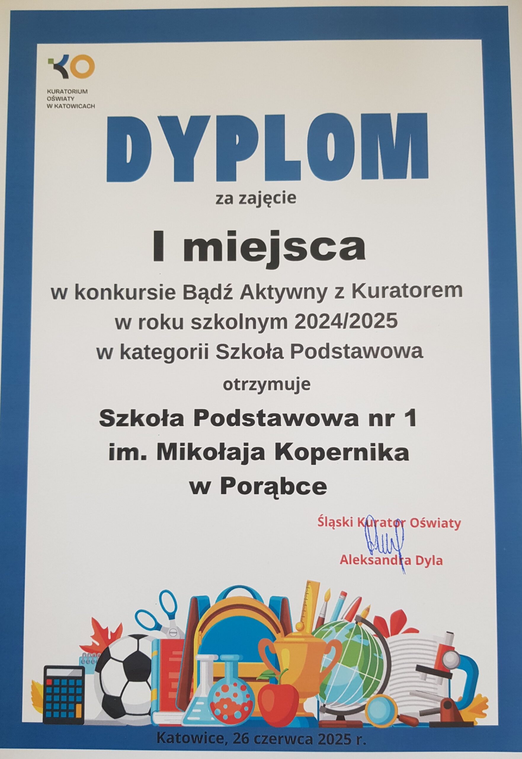 Z olbrzymią satysfakcją informujemy, że po całorocznej realizacji zadań konkursowych, zostaliśmy laureatem I miejsca w nowym konkursie organizowanym przez Śląskiego Kuratora Oświaty pod nazwą „Bądź Aktywny z Kuratorem”. Pierwsza edycja, która odbywała się w roku szkolnym 2024/2025, przebiegała pod hasłem „Piesze wędrówki”.