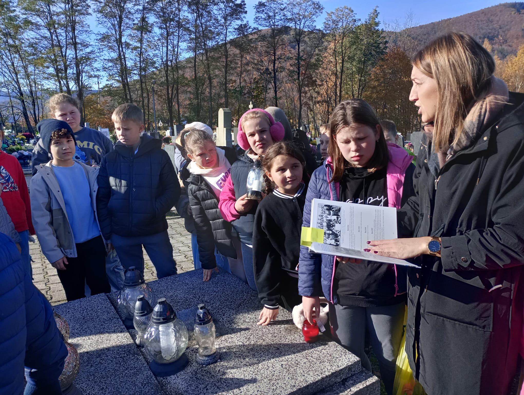 Następnie uczniowie odwiedzili groby zmarłych nauczycieli, którzy w przeszłości pracowali w naszej szkole. Wychowawcy opowiedzieli o dawnych pedagogach – o tym, jakich przedmiotów uczyli i w jakich latach tworzyli historię naszej placówki. Uczniowie zapalili znicze, symbolicznie dziękując za ich pracę i poświęcenie.