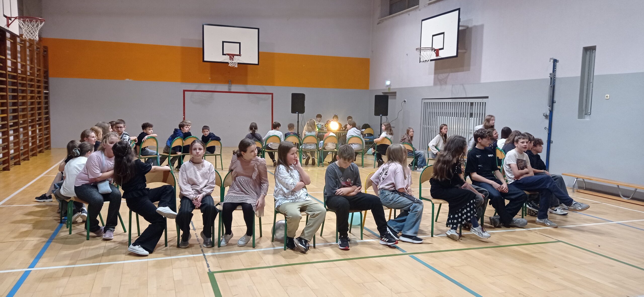 W środowy wieczór w naszej szkole odbyła się wyjątkowa dyskoteka andrzejkowa. Sala gimnastyczna zamieniła się w prawdziwą salę taneczną — pełną kolorowych świateł, muzyki i dobrej energii. Uczniowie bawili się do swoich ulubionych hitów, a na parkiecie panowała wyborna atmosfera. Wszystko to za sprawą uczniów klasy 8b, którzy pełnili rolę gospodarzy na naszej dyskotece. Oczywiście nie zabrakło także tradycyjnych wróżb andrzejkowych, które budziły ogromne zainteresowanie. Dodatkowo każdy mógł sprawdzić, co przyniesie mu przyszłość lub jakie czekają go przygody. Nasze andrzejki przebiegły w radosnej atmosferze, a uczniowie pokazali, że potrafią świetnie się bawić i zintegrować. To był wieczór pełen muzyki, śmiechu i dobrej zabawy!