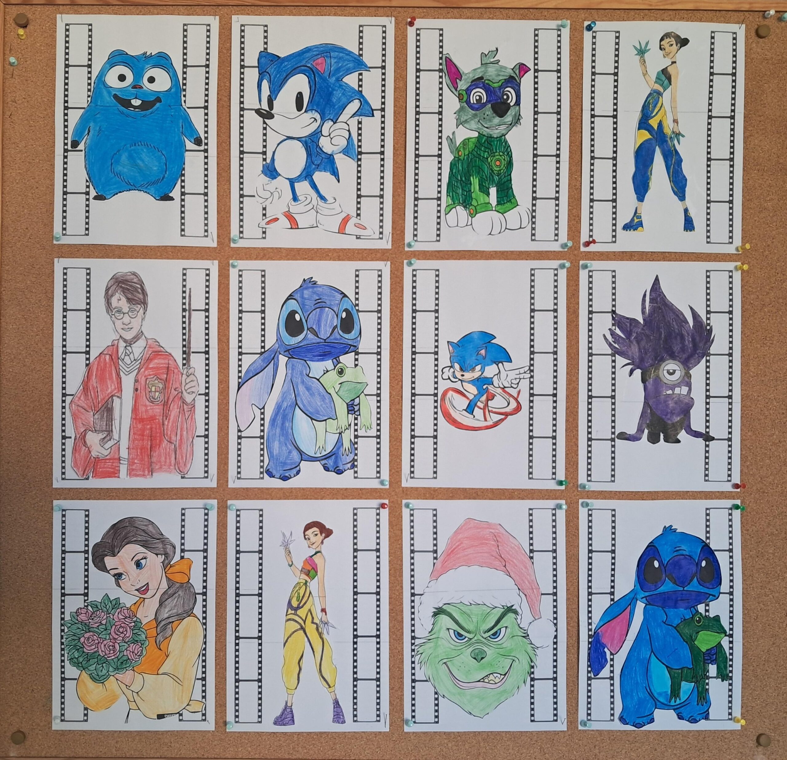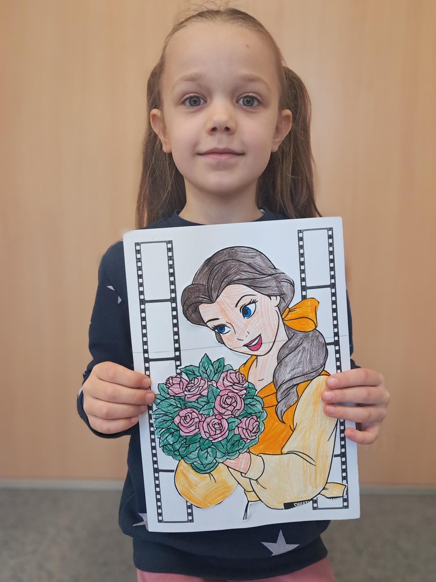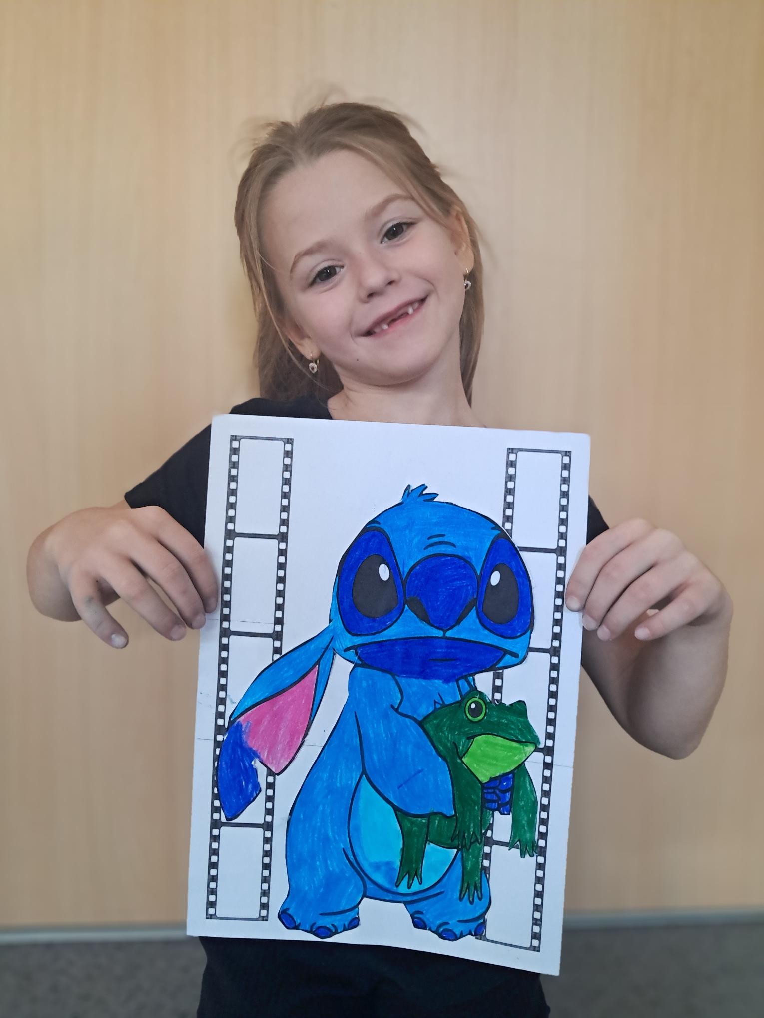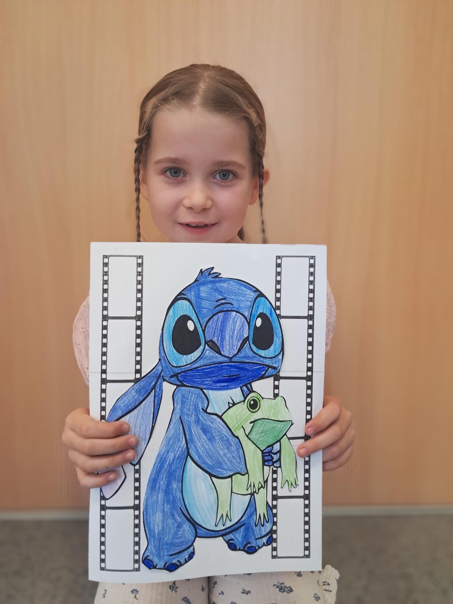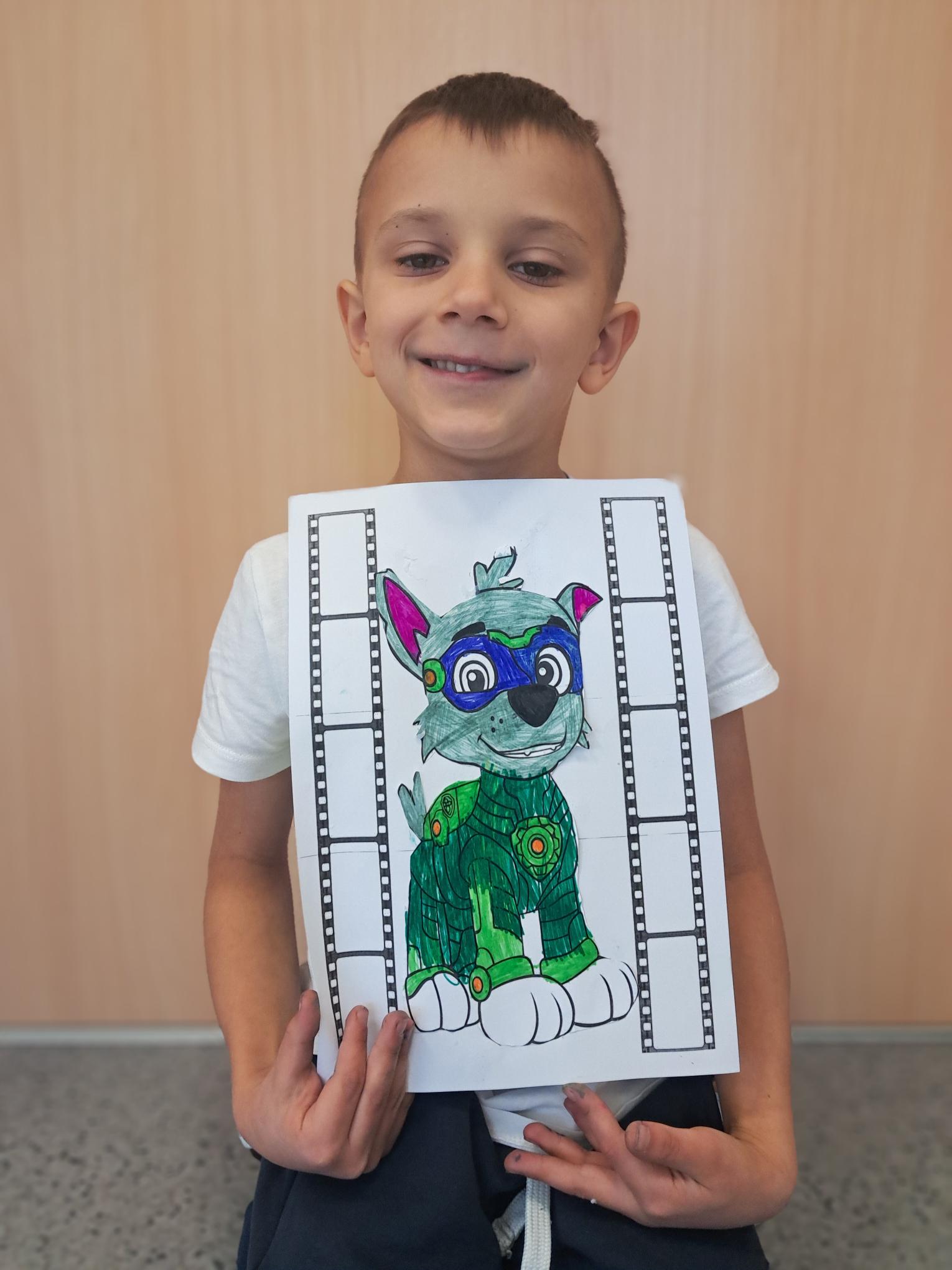Wspólnie oglądaliśmy bajki – zarówno te dobrze znane rodzicom i dziadkom, jak i te współczesne. Następnie każdy uczeń mógł pokolorować swoją ulubioną postać, wyciąć ją i przykleić na przygotowaną „taśmę filmową”, tworząc własną bajkową galerię.