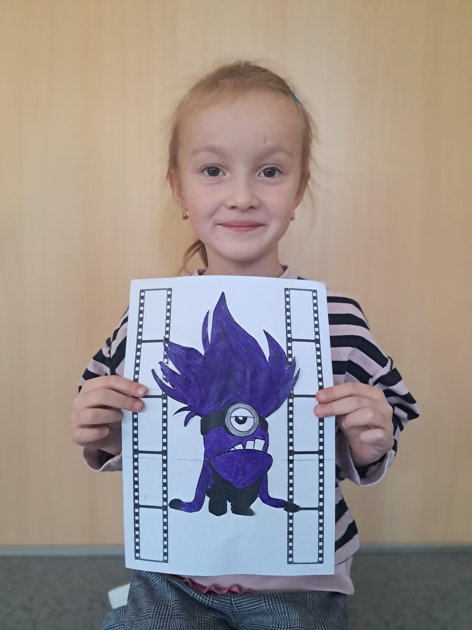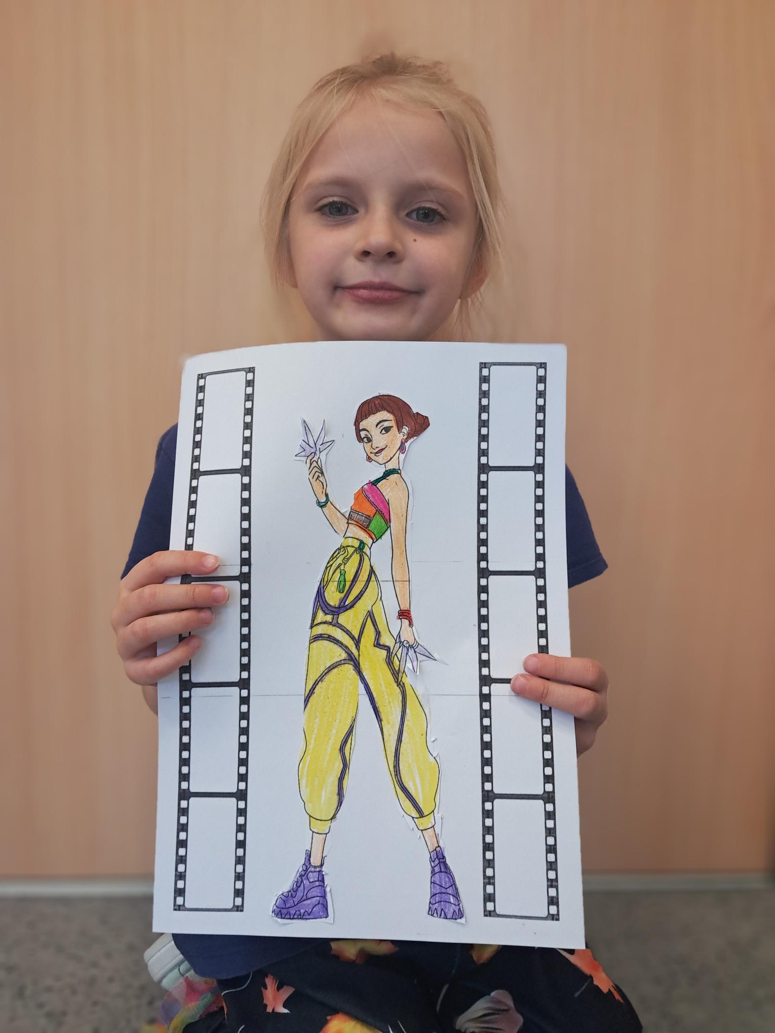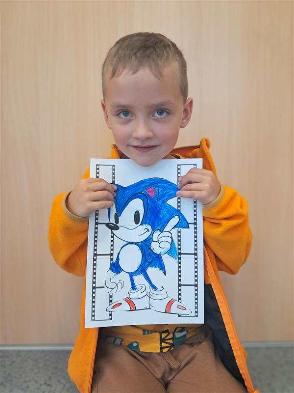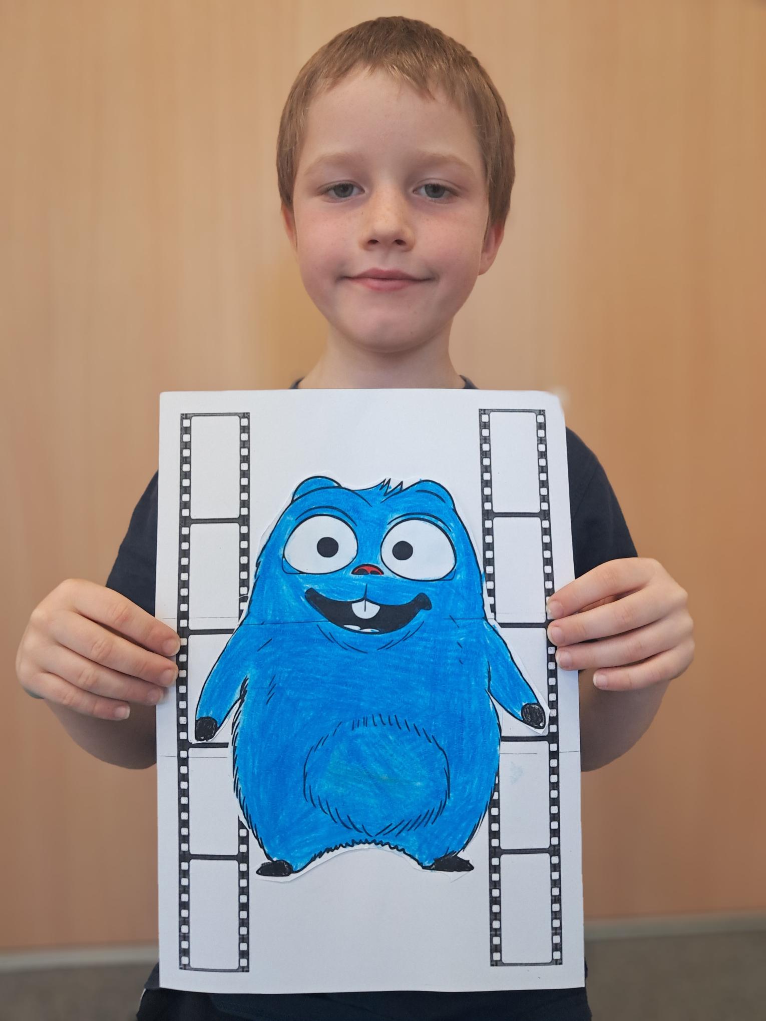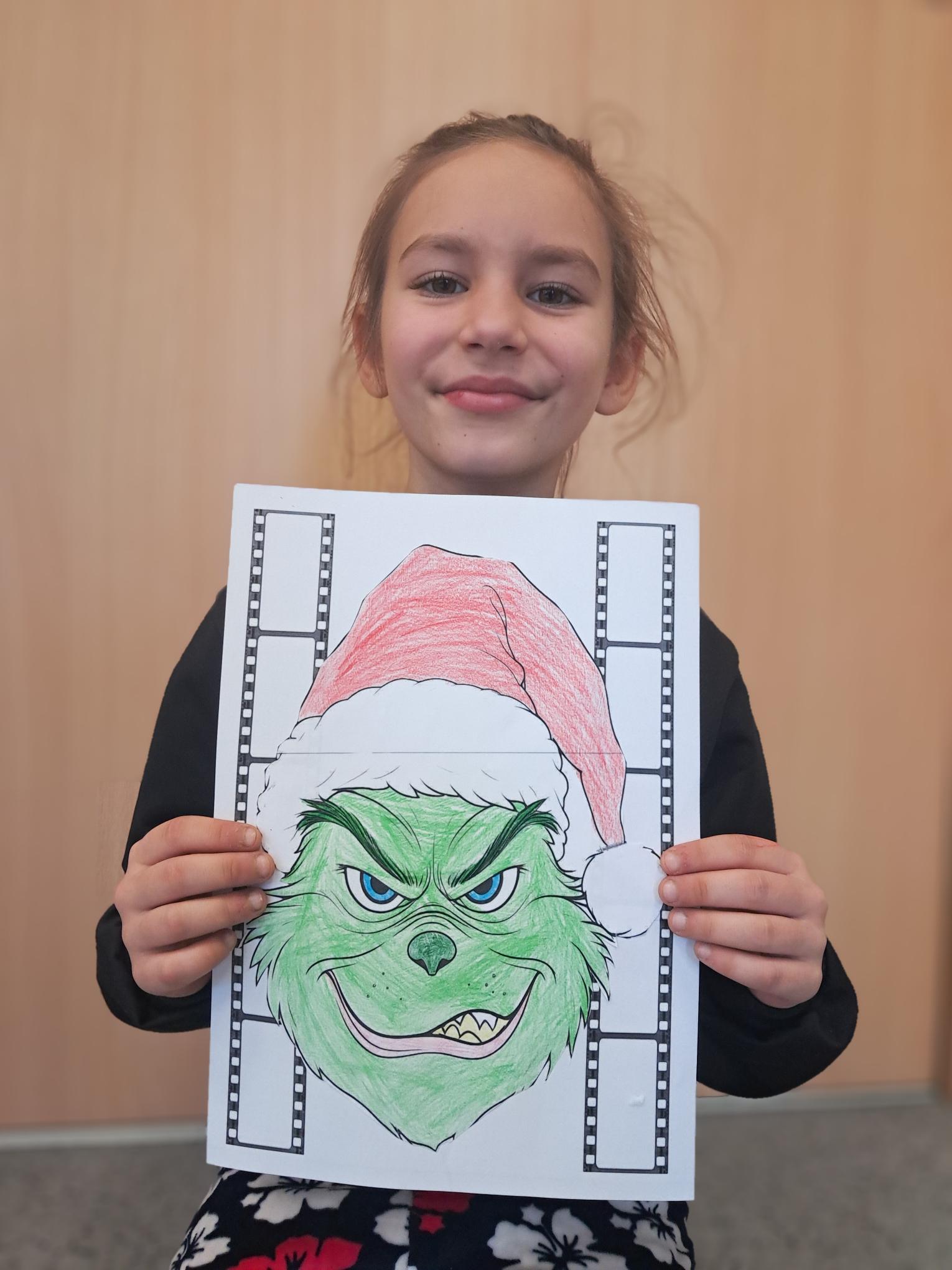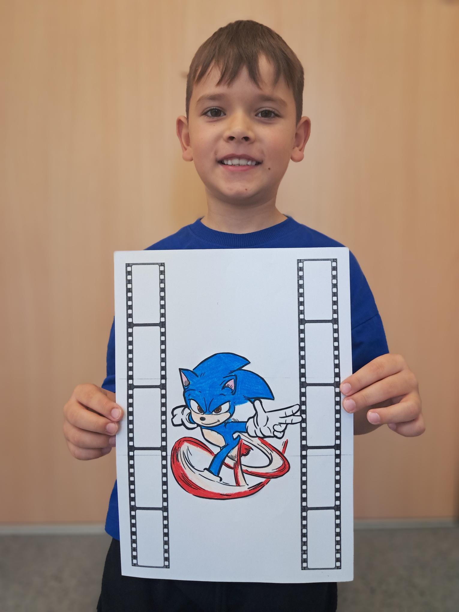 Wspólnie oglądaliśmy bajki – zarówno te dobrze znane rodzicom i dziadkom, jak i te współczesne. Następnie każdy uczeń mógł pokolorować swoją ulubioną postać, wyciąć ją i przykleić na przygotowaną „taśmę filmową”, tworząc własną bajkową galerię.