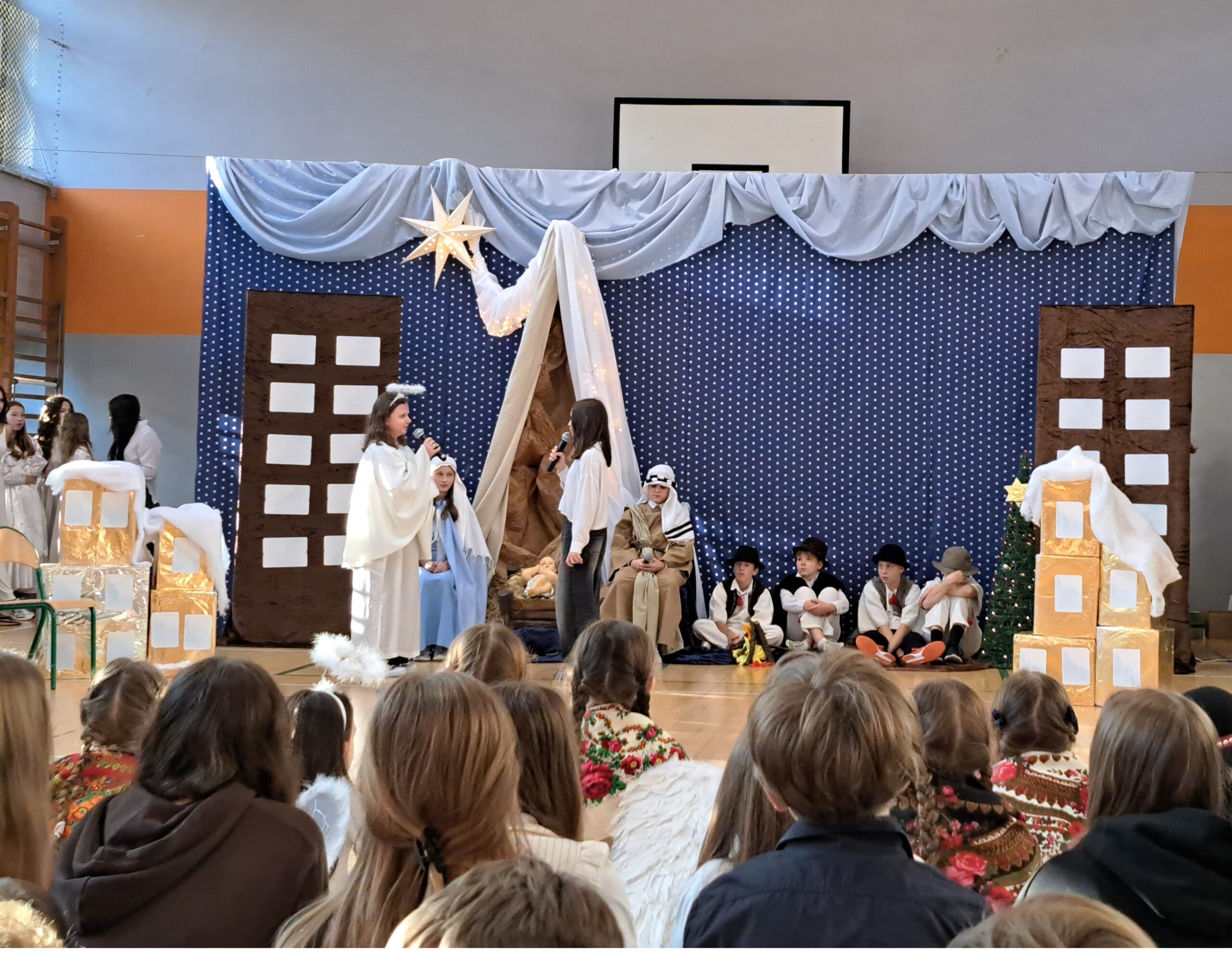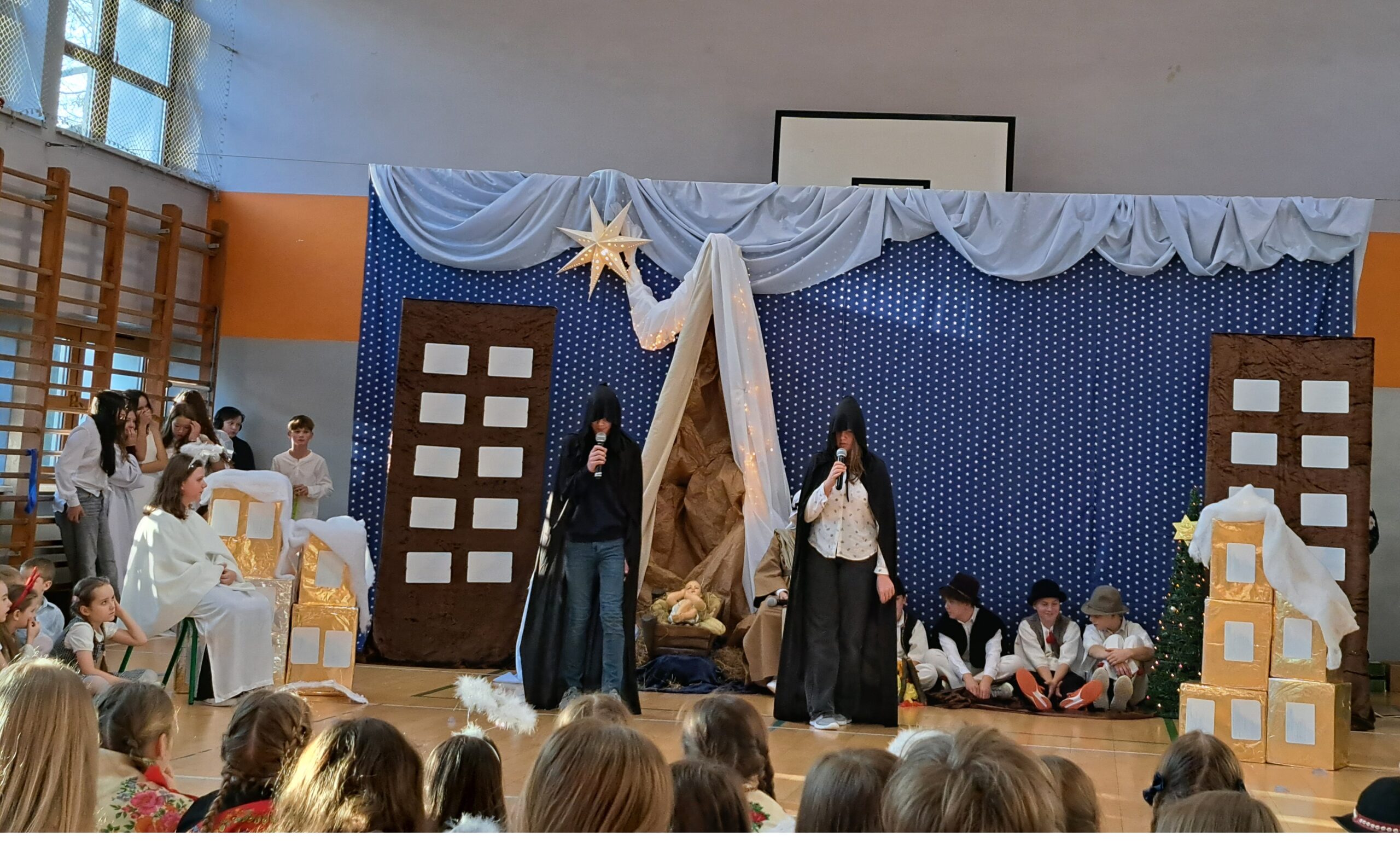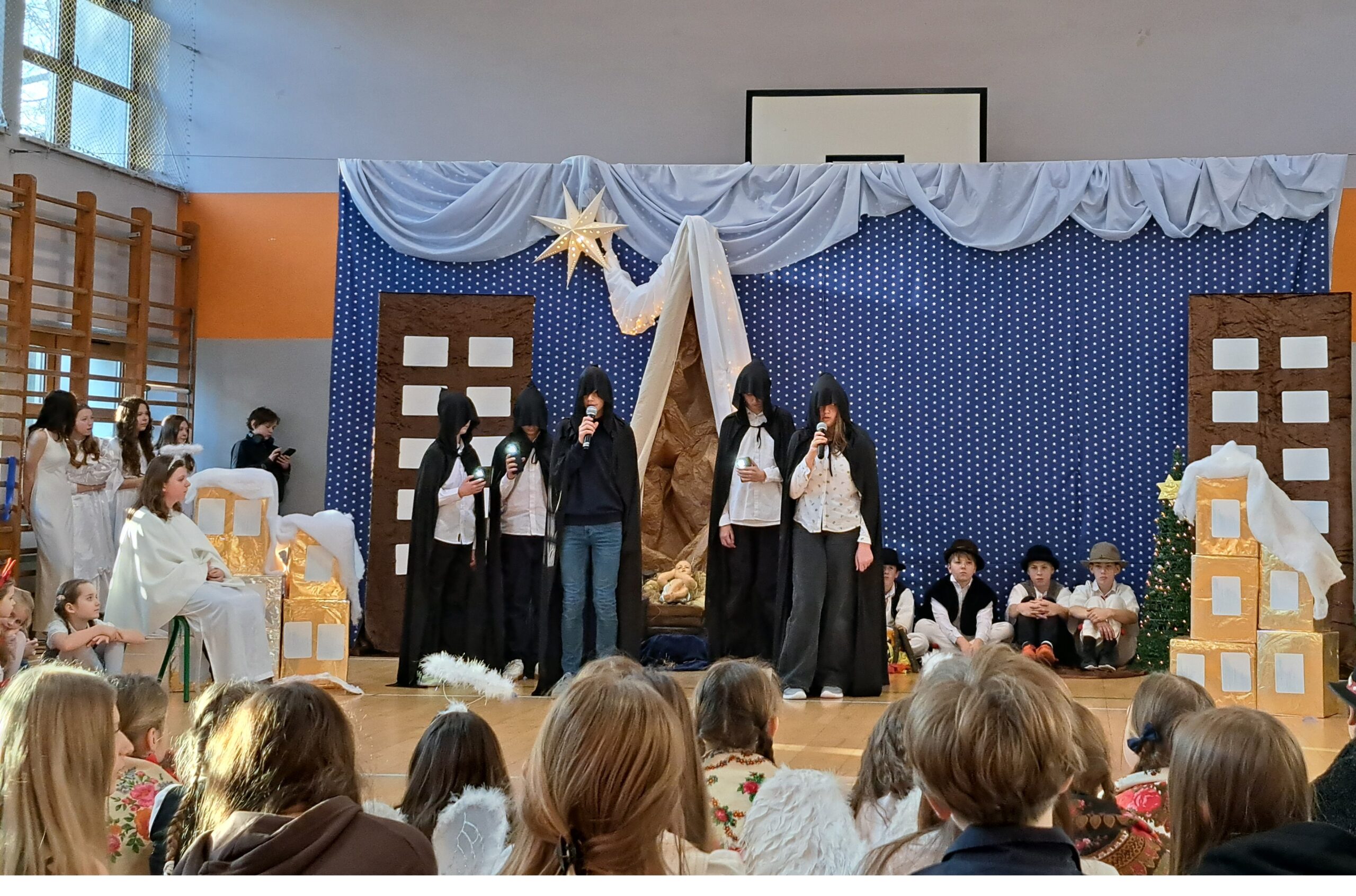 Ponadto wszyscy zebrani mieli okazję obejrzeć spektakl bożonarodzeniowy, który w poruszający sposób połączył tradycyjną historię narodzin Jezusa z refleksją nad współczesnym światem. Przedstawienie ukazało Betlejem sprzed dwóch tysięcy lat oraz ludzi XXI wieku – zabieganych, zapatrzonych w telefony i gubiących prawdziwy sens świąt. Poprzez grę aktorską, taniec, muzykę i śpiew kolęd uczniowie przypomnieli, że Boże Narodzenie to czas ciszy, bliskości, miłości i nadziei, a prawdziwe Betlejem każdy z nas powinien odnaleźć w swoim sercu. Spektakl skłaniał do zatrzymania się, refleksji i spojrzenia na drugiego człowieka z życzliwością. To wyjątkowe wydarzenie wprowadziło widzów w świąteczny nastrój i pozostawiło głębokie, wzruszające przesłanie.