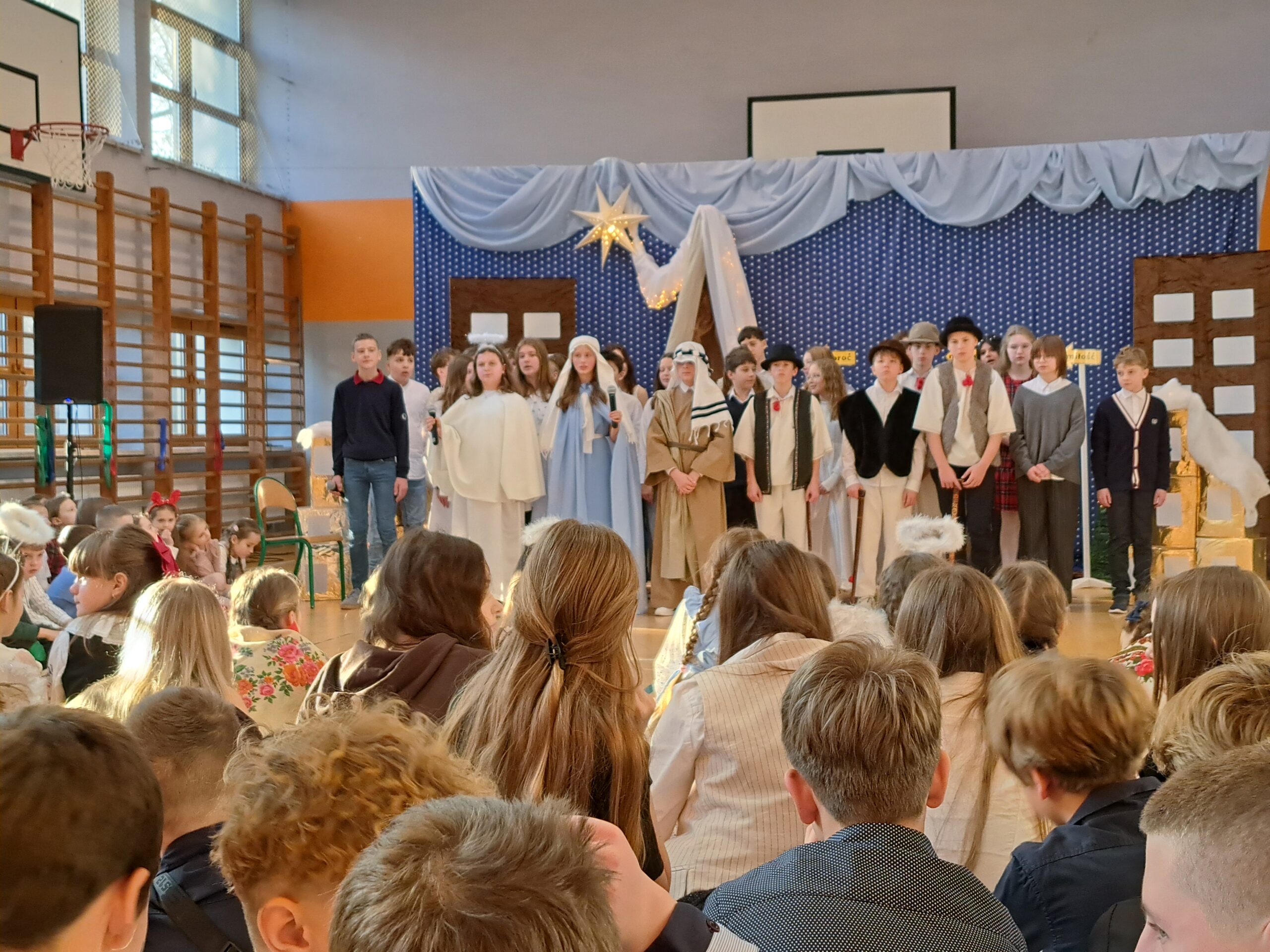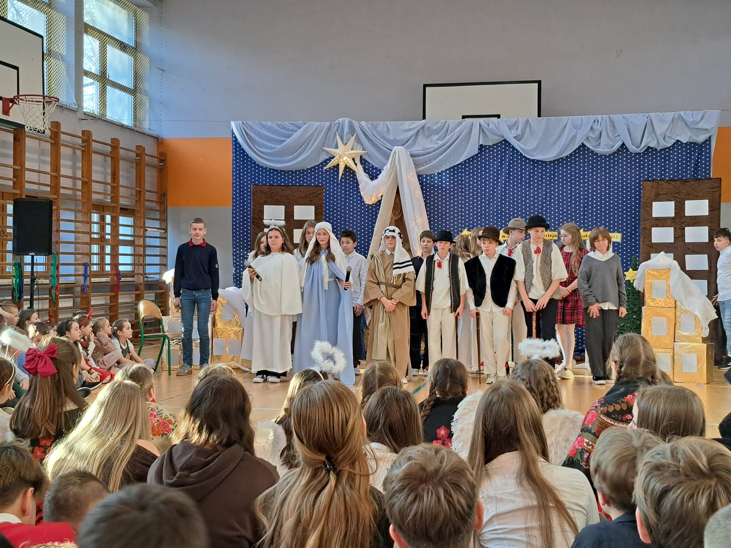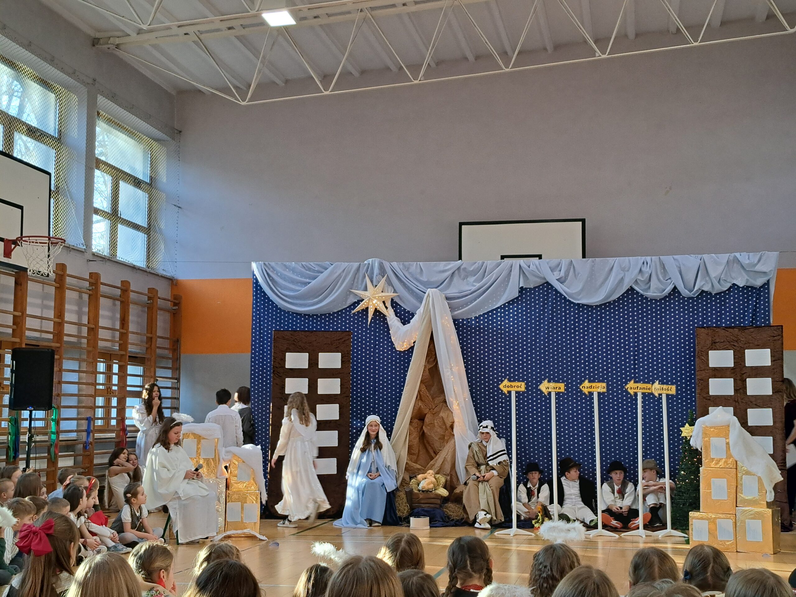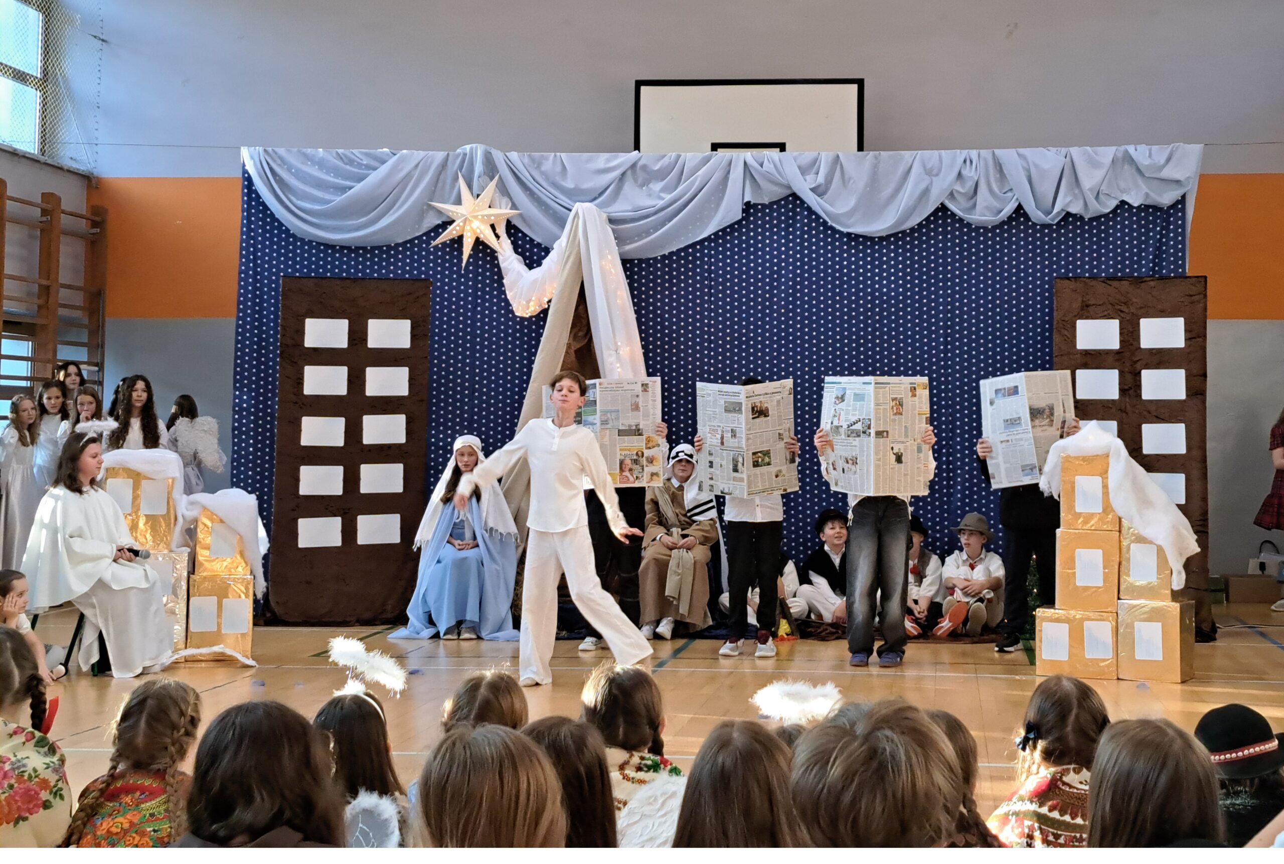 Ponadto wszyscy zebrani mieli okazję obejrzeć spektakl bożonarodzeniowy, który w poruszający sposób połączył tradycyjną historię narodzin Jezusa z refleksją nad współczesnym światem. Przedstawienie ukazało Betlejem sprzed dwóch tysięcy lat oraz ludzi XXI wieku – zabieganych, zapatrzonych w telefony i gubiących prawdziwy sens świąt. Poprzez grę aktorską, taniec, muzykę i śpiew kolęd uczniowie przypomnieli, że Boże Narodzenie to czas ciszy, bliskości, miłości i nadziei, a prawdziwe Betlejem każdy z nas powinien odnaleźć w swoim sercu. Spektakl skłaniał do zatrzymania się, refleksji i spojrzenia na drugiego człowieka z życzliwością. To wyjątkowe wydarzenie wprowadziło widzów w świąteczny nastrój i pozostawiło głębokie, wzruszające przesłanie.
