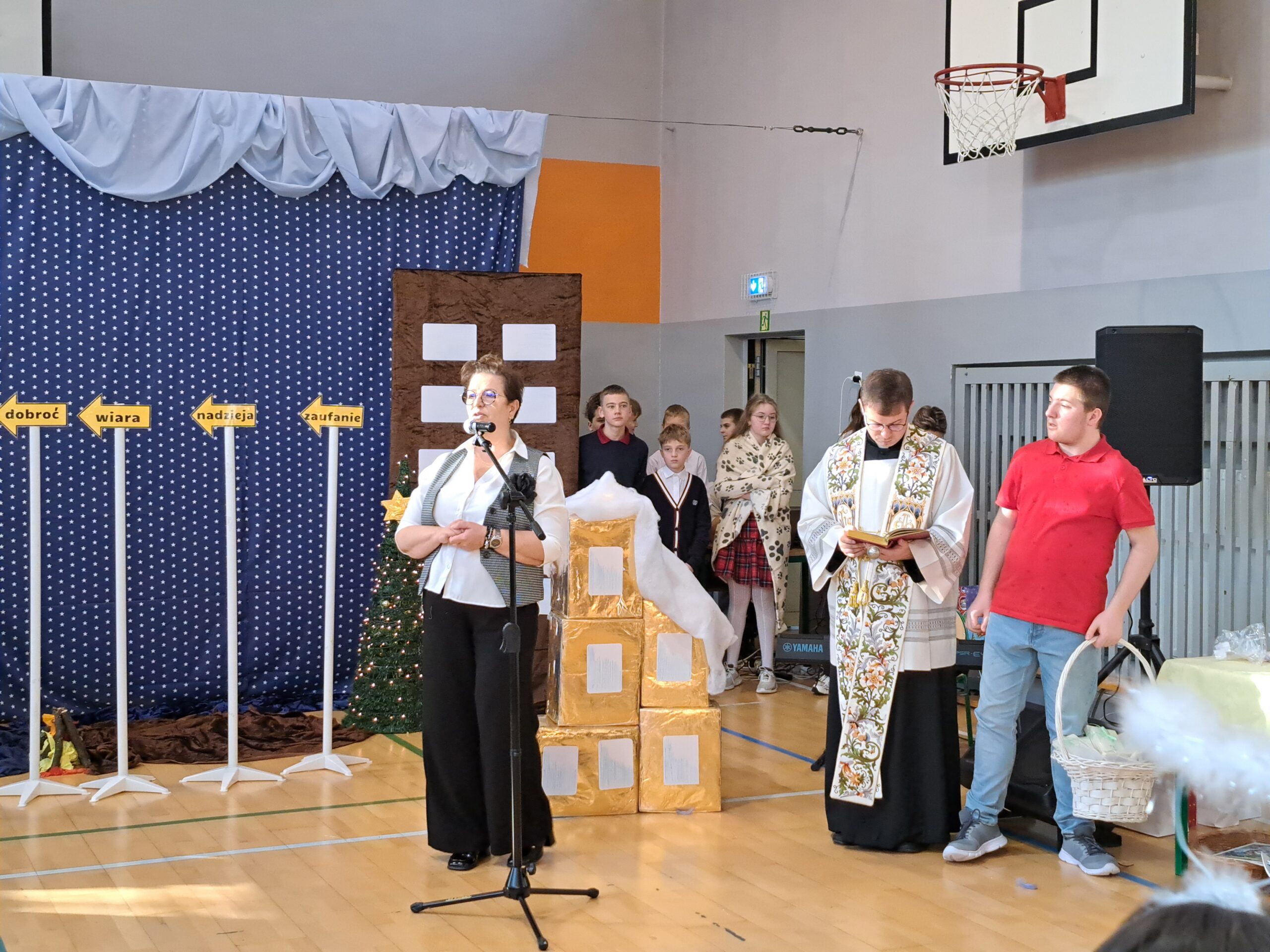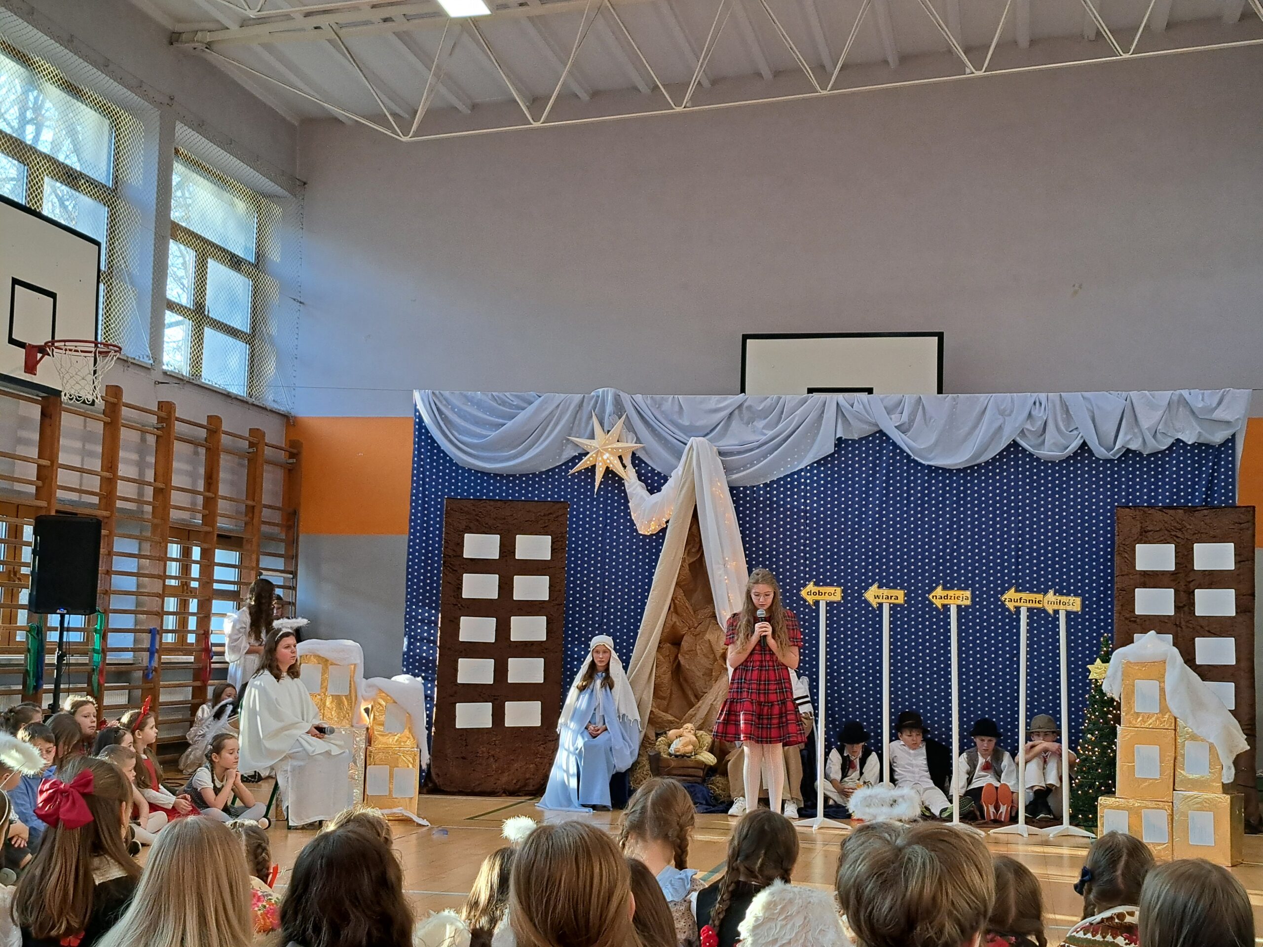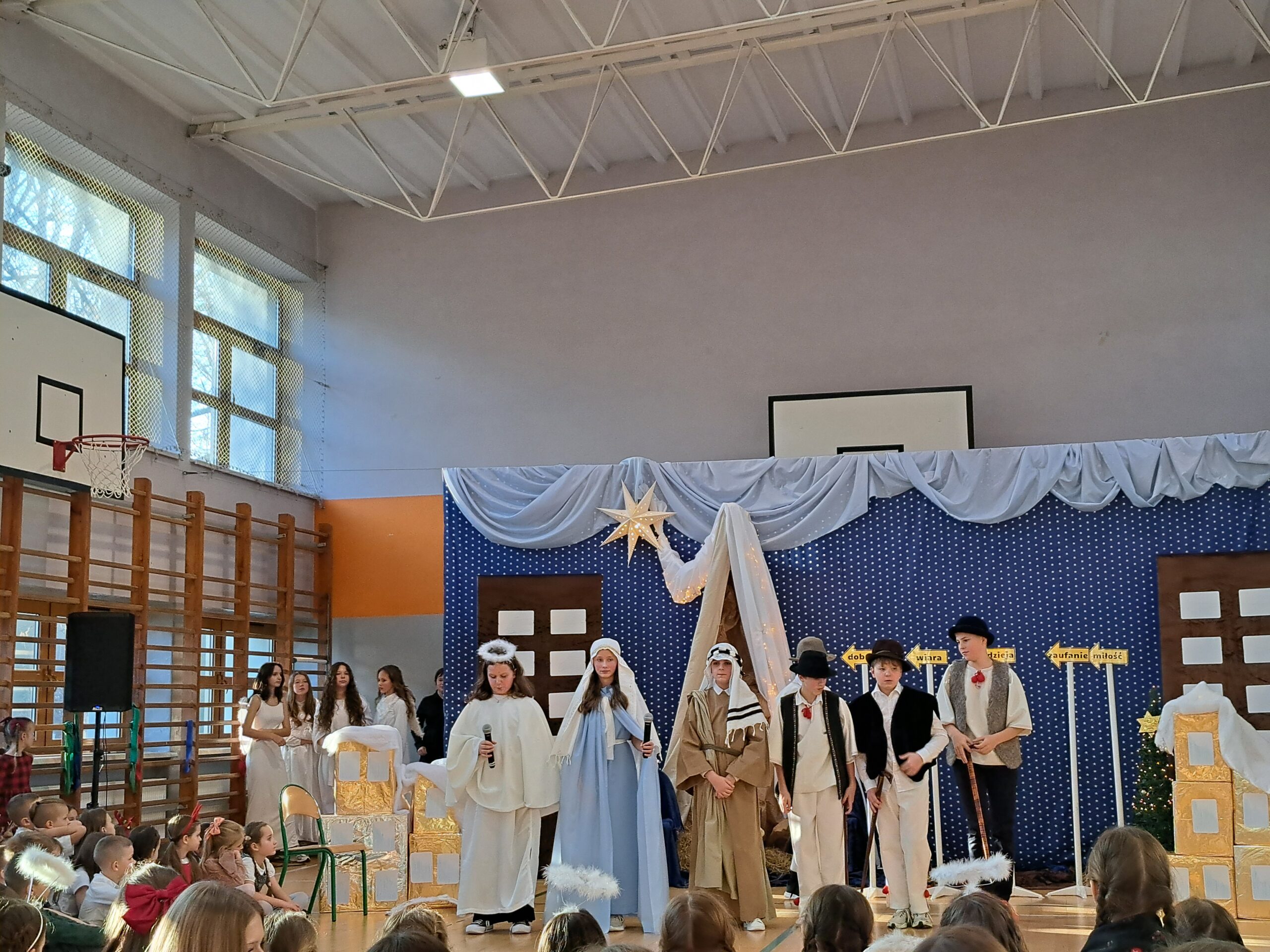Uroczystość uświetniły również występy młodszych uczniów. Na scenie zaprezentowali się kolędnicy z klasy 3a, którzy wprowadzili publiczność w radosny, tradycyjny klimat świąt, a także uczniowie klas 1-3, zachwycając wszystkich pięknym, świątecznym śpiewem pastorałki pt. „Dziś w stajence”. Ich występy spotkały się z gorącym aplauzem i były radosnym dopełnieniem tego wyjątkowego, wigilijnego spotkania.Wych. klas 6 Klaudia Koczur i Bożena Gibas
