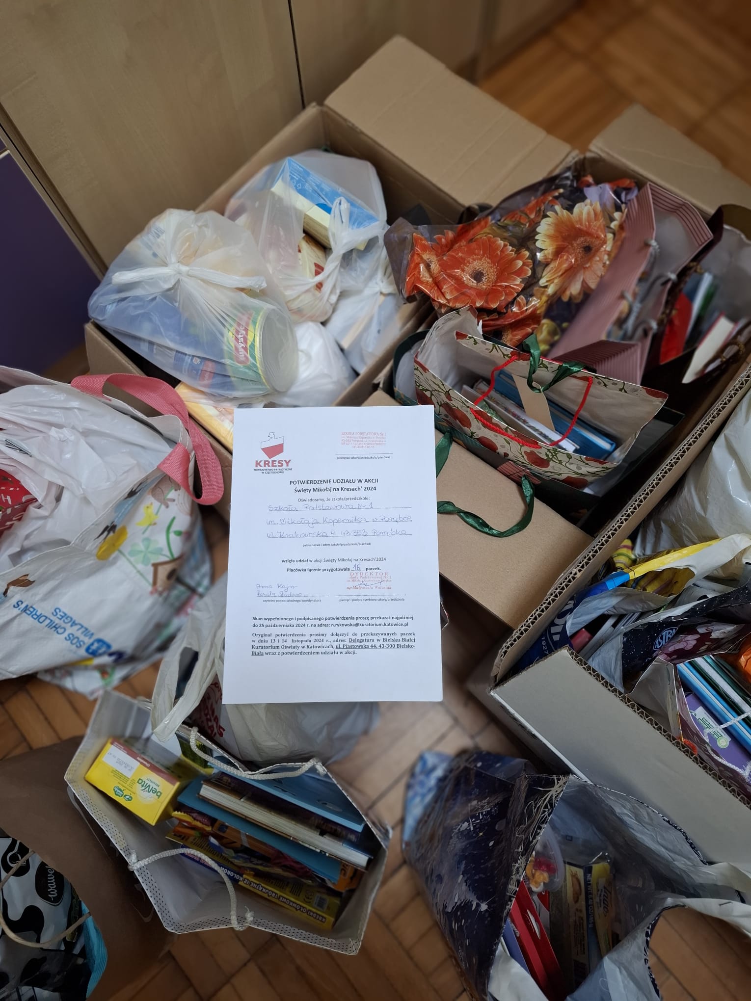 Po raz kolejny nasza szkoła włączyła się w akcję ,,Święty Mikołaj na Kresach” organizowaną przez Towarzystwo Patriotyczne KRESY wraz z Kuratorium Oświaty w Katowicach Delegaturą w Bielsku – Białej. Zebrane produkty zostały przekazane Polakom mieszkającym na Kresach Wschodnich, a w szczególności Rodakom z Wileńszczyzny, obwodu lwowskiego na pogrążonej wojną Ukrainie oraz dzieciom z Grodna na Białorusi. W tym roku zbierane były słodycze, przybory szkolne i dary żywnościowe, z których zostały przygotowane paczki zawierające książkę, zeszyt, kredki, plastelinę, mazaki, długopis, ołówek, czekoladę, baton orzechowy/owocowy, ciastka zbożowe, żelki, dżem, konserwę, ryż, makaron i cukier oraz kartkę z życzeniami świątecznymi od uczniów. Dzięki zaangażowaniu rodziców, dzieci i nauczycieli przygotowaliśmy łącznie 16 paczek.