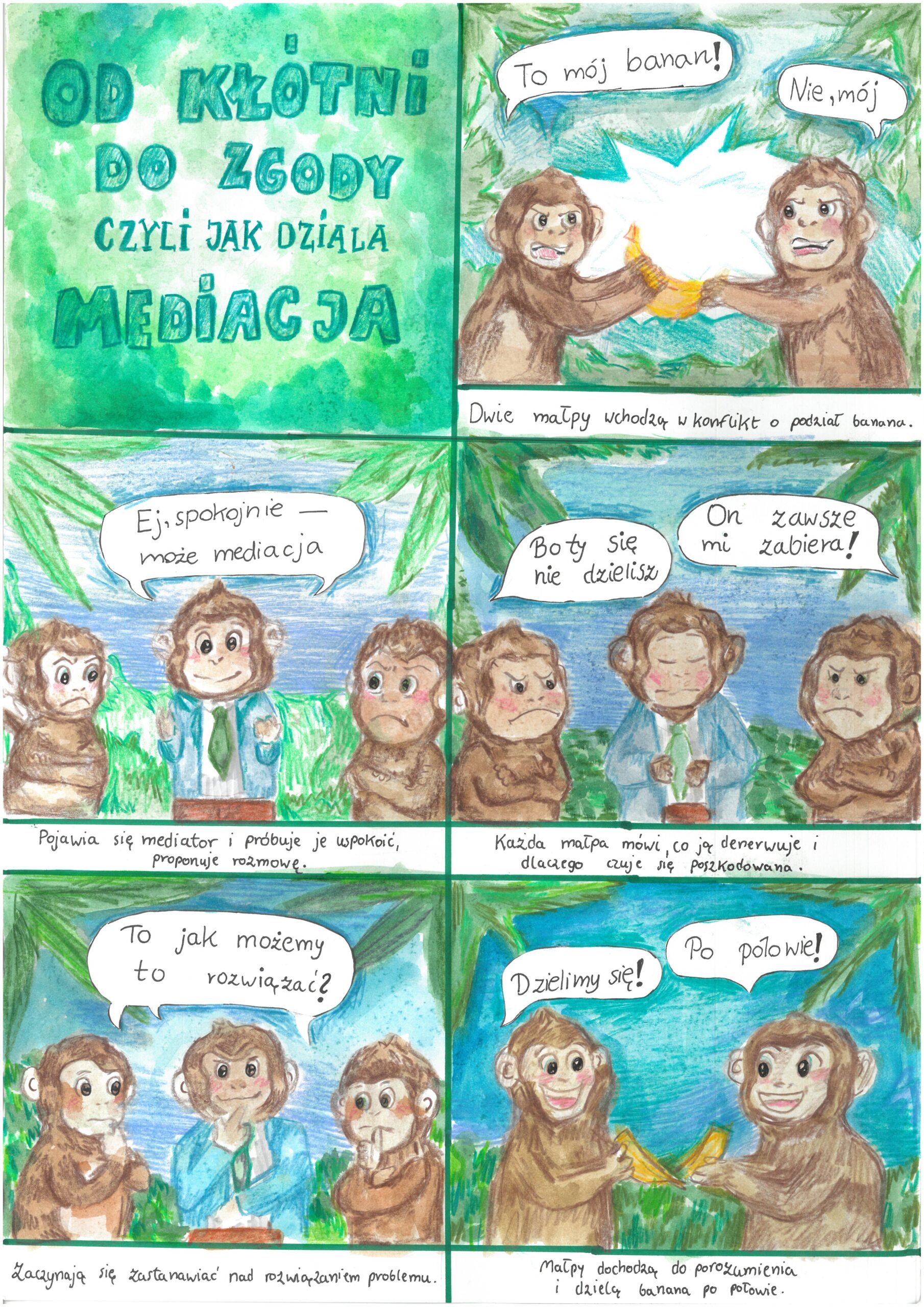 Komiks „Na kłopoty mediacje” pt. „Od kłótni do zgody, czyli jak działa mediacja” w prosty i obrazowy sposób pokazuje, jak można rozwiązywać konflikty bez kłótni. Praca powstała w marcu 2026 r. Historia przedstawia dwie małpki, które spierają się o jednego banana. Sytuacja wydaje się trudna, dopóki nie pojawia się mediator – spokojny i bezstronny pomocnik. Zachęca on bohaterów do rozmowy i wysłuchania siebie nawzajem. Każda z małpek ma szansę powiedzieć, co ją denerwuje i dlaczego czuje się pokrzywdzona. Dzięki temu zaczynają lepiej się rozumieć i wspólnie szukają rozwiązania. Ostatecznie dochodzą do porozumienia i dzielą banana po połowie. Komiks pokazuje młodzieży, że mediacja to skuteczny sposób na rozwiązywanie sporów poprzez dialog, zrozumienie i współpracę.