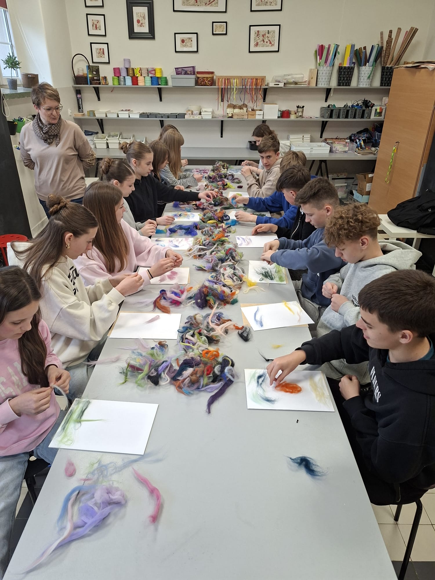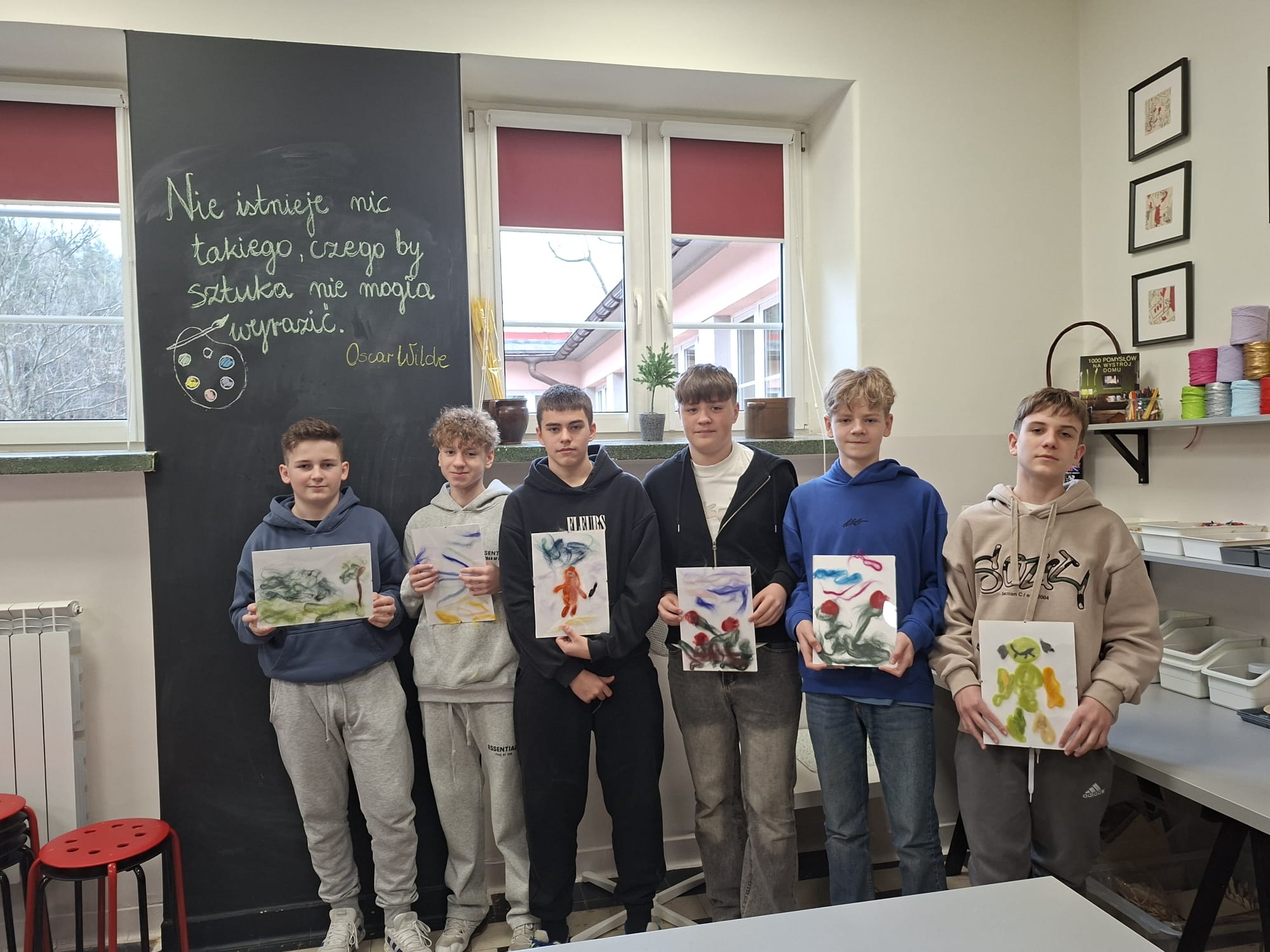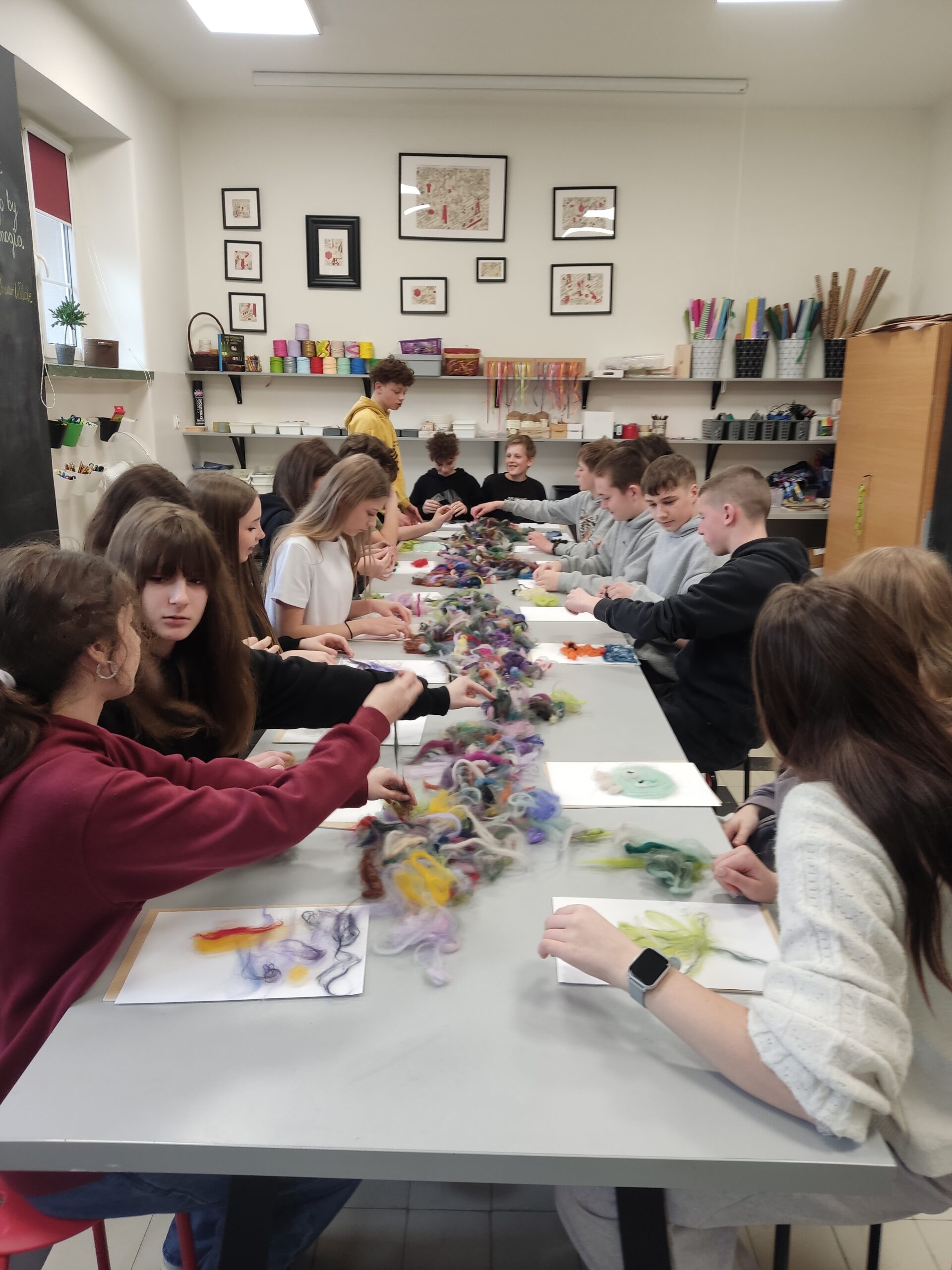 Nie zabrakło także działań artystycznych – uczestnicy tworzyli wyjątkowe obrazy z kolorowej wełny czesankowej, rozwijając swoją wyobraźnię i zdolności manualne. Ważnym elementem spotkania była również edukacja ekologiczna. Uczniowie przypomnieli sobie zasady prawidłowej segregacji odpadów oraz mieli okazję wykorzystać zdobytą wiedzę w praktyce.