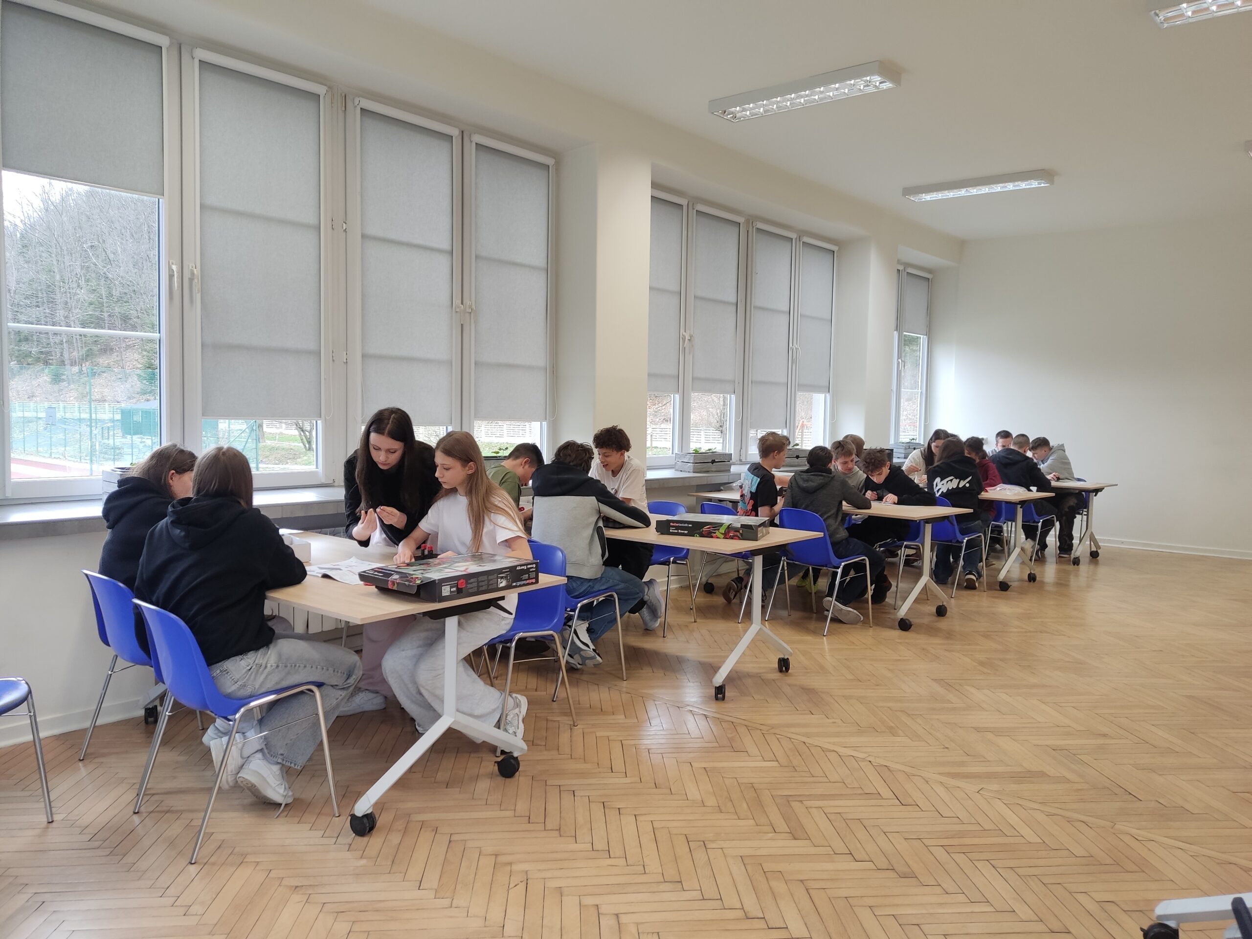Dodatkowo pracując w grupach, tworzyli makiety z klocków LEGO, a następnie prezentowali i opowiadali historie związane ze swoimi projektami. To zadanie rozwijało nie tylko kreatywność, ale także umiejętność współpracy i komunikacji.