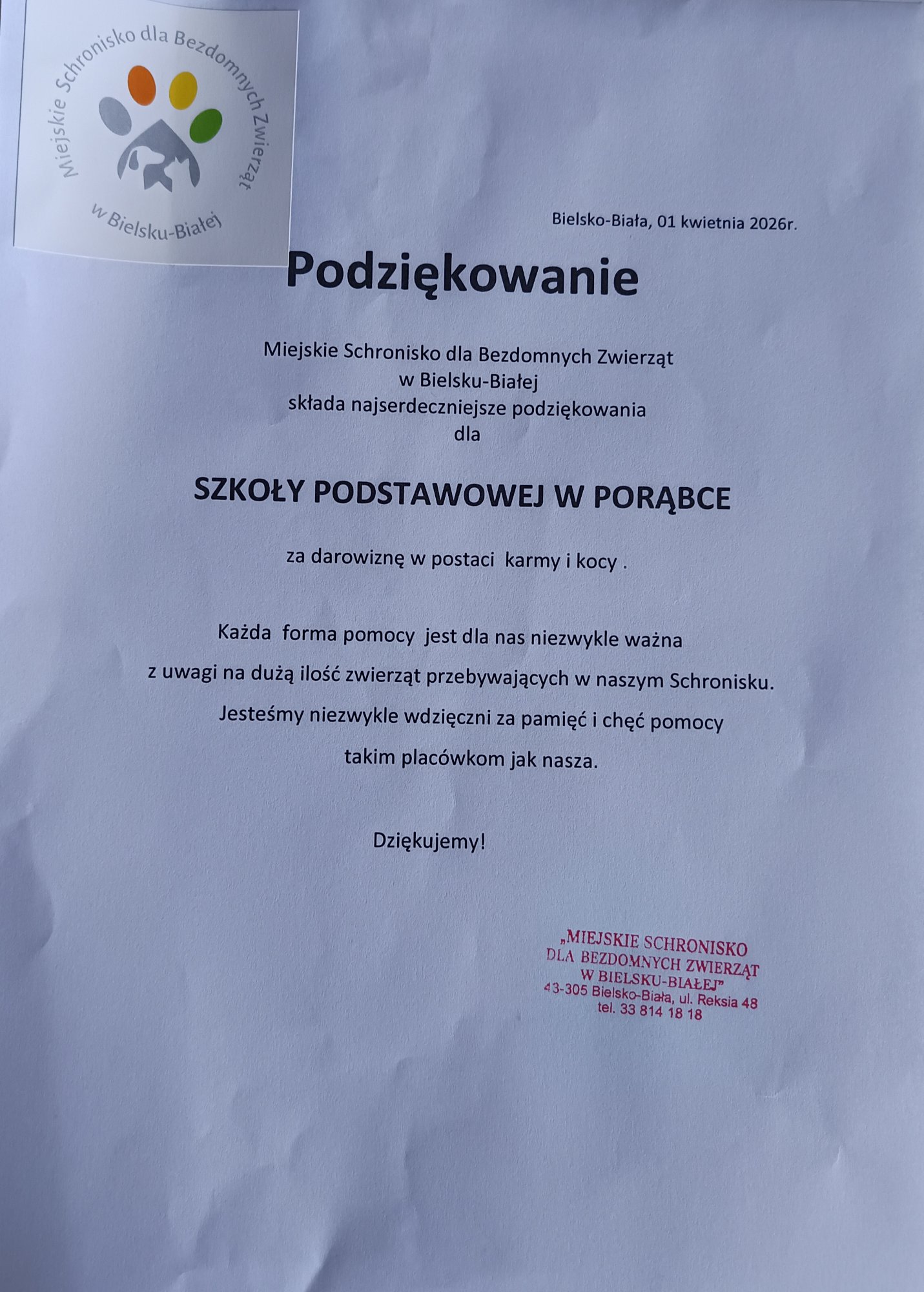 W marcu, w naszej szkole, została zorganizowana zbiórka karmy dla podopiecznych Miejskiego Schroniska dla Bezdomnych Zwierząt ,,Reksio” w Bielsku – Białej. Mamy nadzieję, że ofiarowane dary choć trochę wpłyną na poprawę standardu życia zwierząt przebywających w schroniskach. Cieszymy się, że tak wiele rodzin odpowiedziało na nasz apel i wzięło udział w zorganizowanej przez nas akcji charytatywnej.